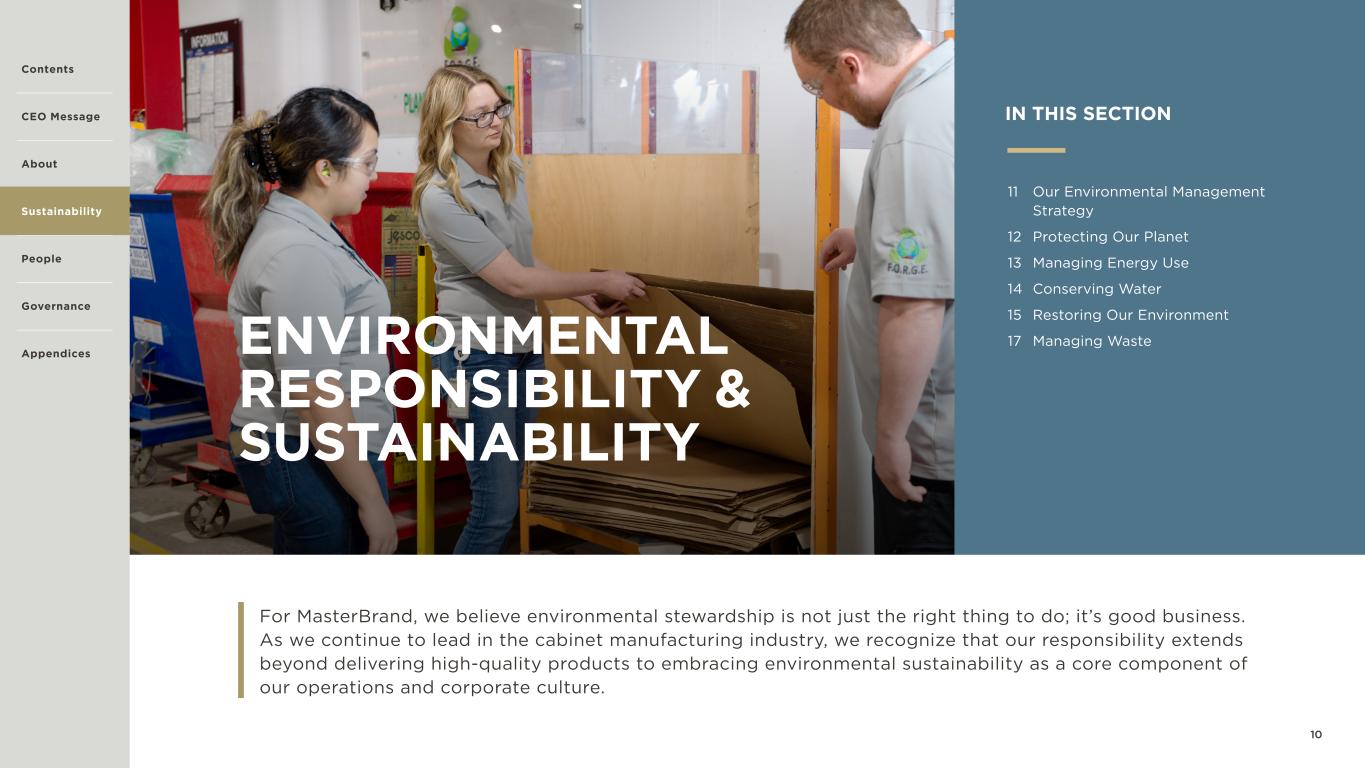 10 ENVIRONMENTAL RESPONSIBILITY & SUSTAINABILITY For MasterBrand, we believe environmental stewardship is not just the right thing to do; it’s good business. As we continue to lead in the cabinet manufacturing industry, we recognize that our responsibility extends beyond delivering high-quality products to embracing environmental sustainability as a core component of our operations and corporate culture. Contents CEO Message About Sustainability Governance Appendices IN THIS SECTION 11 Our Environmental Management Strategy 12 Protecting Our Planet 13 Managing Energy Use 14 Conserving Water 15 Restoring Our Environment 17 Managing Waste People
