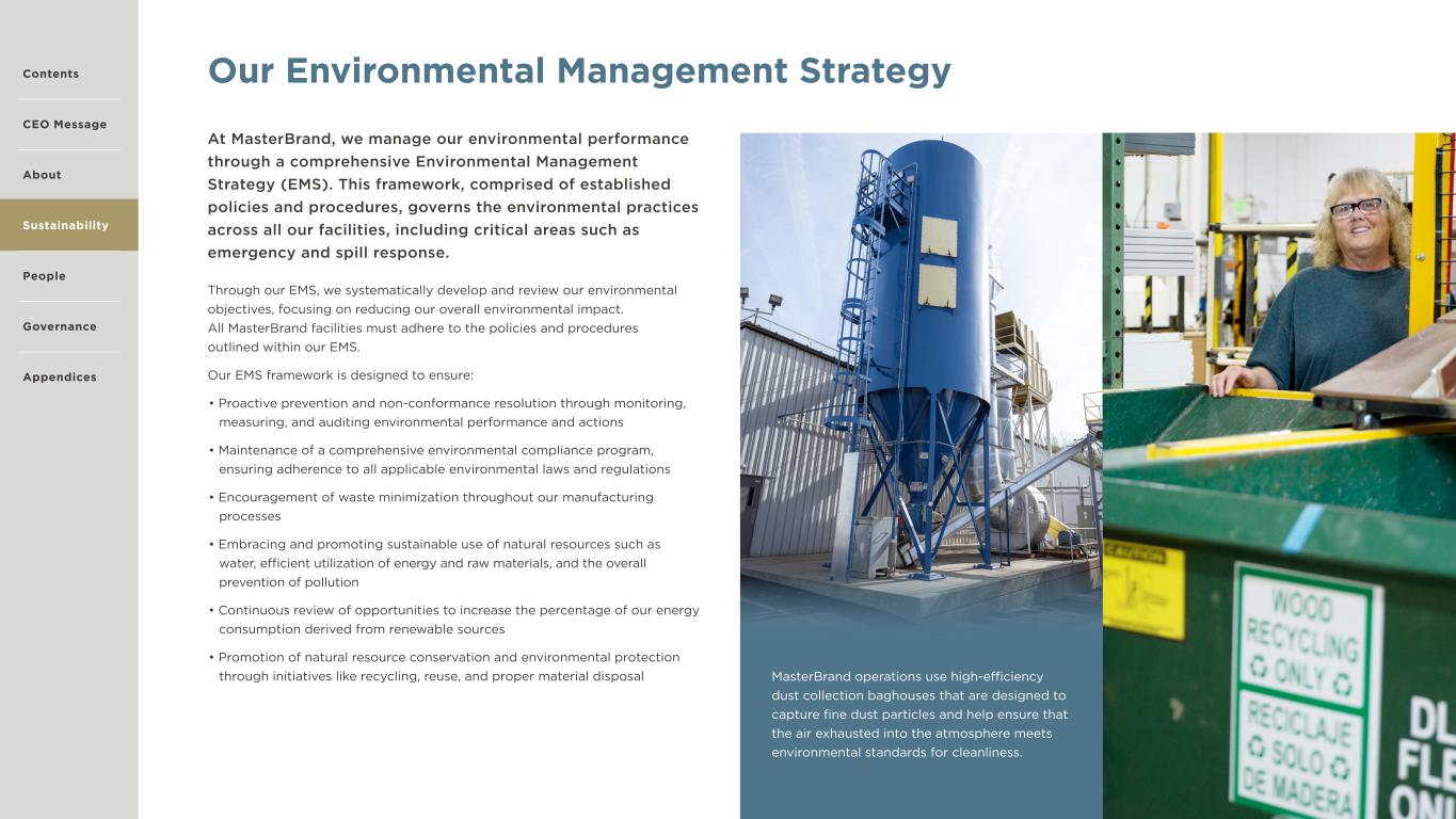 11 Our Environmental Management Strategy Through our EMS, we systematically develop and review our environmental objectives, focusing on reducing our overall environmental impact. All MasterBrand facilities must adhere to the policies and procedures outlined within our EMS. Our EMS framework is designed to ensure: • Proactive prevention and non-conformance resolution through monitoring, measuring, and auditing environmental performance and actions • Maintenance of a comprehensive environmental compliance program, ensuring adherence to all applicable environmental laws and regulations • Encouragement of waste minimization throughout our manufacturing processes • Embracing and promoting sustainable use of natural resources such as water, efficient utilization of energy and raw materials, and the overall prevention of pollution • Continuous review of opportunities to increase the percentage of our energy consumption derived from renewable sources • Promotion of natural resource conservation and environmental protection through initiatives like recycling, reuse, and proper material disposal At MasterBrand, we manage our environmental performance through a comprehensive Environmental Management Strategy (EMS). This framework, comprised of established policies and procedures, governs the environmental practices across all our facilities, including critical areas such as emergency and spill response. Contents CEO Message About Sustainability Governance Appendices People MasterBrand operations use high-efficiency dust collection baghouses that are designed to capture fine dust particles and help ensure that the air exhausted into the atmosphere meets environmental standards for cleanliness.