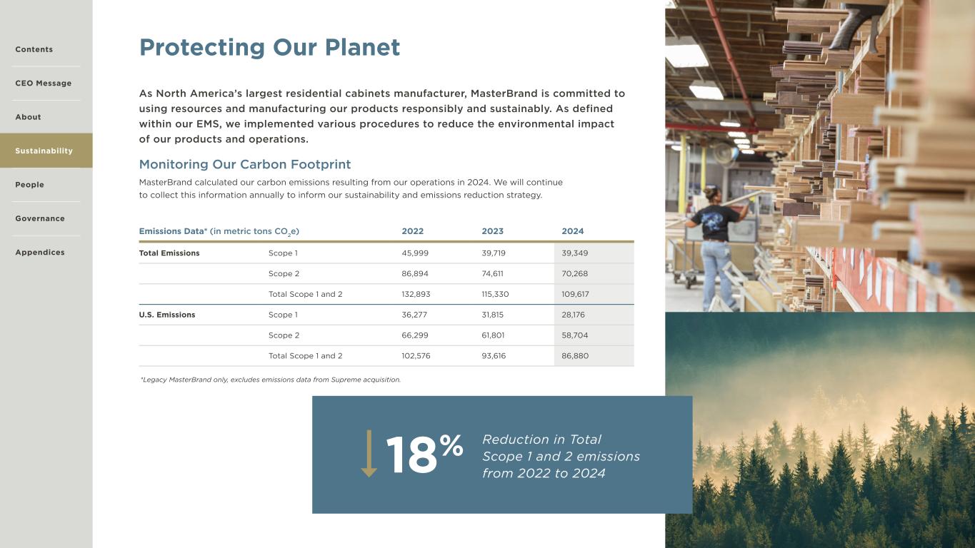 12 Protecting Our Planet As North America’s largest residential cabinets manufacturer, MasterBrand is committed to using resources and manufacturing our products responsibly and sustainably. As defined within our EMS, we implemented various procedures to reduce the environmental impact of our products and operations. Monitoring Our Carbon Footprint MasterBrand calculated our carbon emissions resulting from our operations in 2024. We will continue to collect this information annually to inform our sustainability and emissions reduction strategy. Emissions Data* (in metric tons CO2e) 2022 2023 2024 Total Emissions Scope 1 45,999 39,719 39,349 Scope 2 86,894 74,611 70,268 Total Scope 1 and 2 132,893 115,330 109,617 U.S. Emissions Scope 1 36,277 31,815 28,176 Scope 2 66,299 61,801 58,704 Total Scope 1 and 2 102,576 93,616 86,880 Reduction in Total Scope 1 and 2 emissions from 2022 to 202418% Contents CEO Message About Sustainability Governance Appendices People *Legacy MasterBrand only, excludes emissions data from Supreme acquisition.