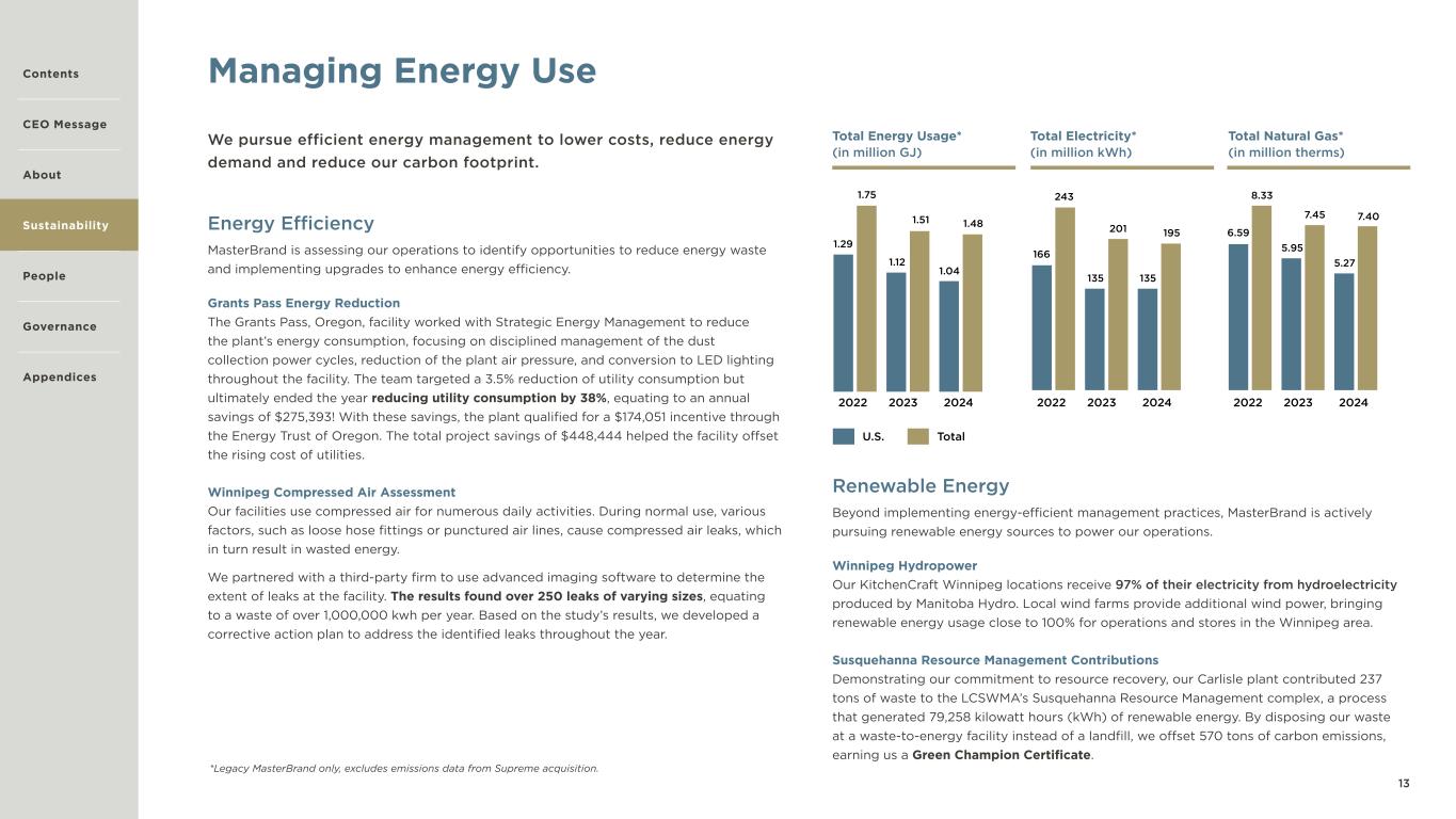 13 Managing Energy Use We pursue efficient energy management to lower costs, reduce energy demand and reduce our carbon footprint. Energy Efficiency MasterBrand is assessing our operations to identify opportunities to reduce energy waste and implementing upgrades to enhance energy efficiency. Grants Pass Energy Reduction The Grants Pass, Oregon, facility worked with Strategic Energy Management to reduce the plant’s energy consumption, focusing on disciplined management of the dust collection power cycles, reduction of the plant air pressure, and conversion to LED lighting throughout the facility. The team targeted a 3.5% reduction of utility consumption but ultimately ended the year reducing utility consumption by 38%, equating to an annual savings of $275,393! With these savings, the plant qualified for a $174,051 incentive through the Energy Trust of Oregon. The total project savings of $448,444 helped the facility offset the rising cost of utilities. Winnipeg Compressed Air Assessment Our facilities use compressed air for numerous daily activities. During normal use, various factors, such as loose hose fittings or punctured air lines, cause compressed air leaks, which in turn result in wasted energy. We partnered with a third-party firm to use advanced imaging software to determine the extent of leaks at the facility. The results found over 250 leaks of varying sizes, equating to a waste of over 1,000,000 kwh per year. Based on the study’s results, we developed a corrective action plan to address the identified leaks throughout the year. Renewable Energy Beyond implementing energy-efficient management practices, MasterBrand is actively pursuing renewable energy sources to power our operations. Winnipeg Hydropower Our KitchenCraft Winnipeg locations receive 97% of their electricity from hydroelectricity produced by Manitoba Hydro. Local wind farms provide additional wind power, bringing renewable energy usage close to 100% for operations and stores in the Winnipeg area. Susquehanna Resource Management Contributions Demonstrating our commitment to resource recovery, our Carlisle plant contributed 237 tons of waste to the LCSWMA’s Susquehanna Resource Management complex, a process that generated 79,258 kilowatt hours (kWh) of renewable energy. By disposing our waste at a waste-to-energy facility instead of a landfill, we offset 570 tons of carbon emissions, earning us a Green Champion Certificate. Total Energy Usage* (in million GJ) 2022 1.04 1.12 1.29 1.481.51 1.75 2023 2024 2022 135135 166 195201 243 2023 2024 Total Electricity* (in million kWh) U.S. Total 2022 2023 2024 Total Natural Gas* (in million therms) 5.27 5.95 6.59 7.407.45 8.33 Contents CEO Message About Sustainability Governance Appendices People *Legacy MasterBrand only, excludes emissions data from Supreme acquisition.