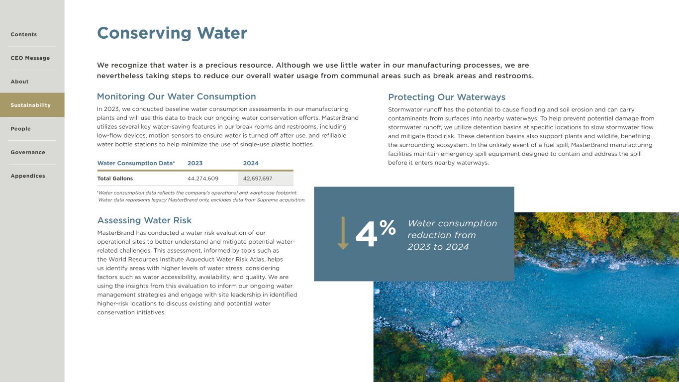 14 Conserving Water We recognize that water is a precious resource. Although we use little water in our manufacturing processes, we are nevertheless taking steps to reduce our overall water usage from communal areas such as break areas and restrooms. Monitoring Our Water Consumption In 2023, we conducted baseline water consumption assessments in our manufacturing plants and will use this data to track our ongoing water conservation efforts. MasterBrand utilizes several key water-saving features in our break rooms and restrooms, including low-flow devices, motion sensors to ensure water is turned off after use, and refillable water bottle stations to help minimize the use of single-use plastic bottles. Assessing Water Risk MasterBrand has conducted a water risk evaluation of our operational sites to better understand and mitigate potential water- related challenges. This assessment, informed by tools such as the World Resources Institute Aqueduct Water Risk Atlas, helps us identify areas with higher levels of water stress, considering factors such as water accessibility, availability, and quality. We are using the insights from this evaluation to inform our ongoing water management strategies and engage with site leadership in identified higher-risk locations to discuss existing and potential water conservation initiatives. Protecting Our Waterways Stormwater runoff has the potential to cause flooding and soil erosion and can carry contaminants from surfaces into nearby waterways. To help prevent potential damage from stormwater runoff, we utilize detention basins at specific locations to slow stormwater flow and mitigate flood risk. These detention basins also support plants and wildlife, benefiting the surrounding ecosystem. In the unlikely event of a fuel spill, MasterBrand manufacturing facilities maintain emergency spill equipment designed to contain and address the spill before it enters nearby waterways.Water Consumption Data* 2023 2024 Total Gallons 44,274,609 42,697,697 *Water consumption data reflects the company’s operational and warehouse footprint. Water data represents legacy MasterBrand only, excludes data from Supreme acquisition. Water consumption reduction from 2023 to 20244% Contents CEO Message About Sustainability Governance Appendices People