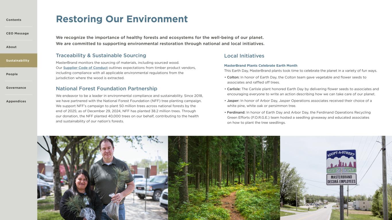 15 Restoring Our Environment Traceability & Sustainable Sourcing MasterBrand monitors the sourcing of materials, including sourced wood. Our Supplier Code of Conduct outlines expectations from timber product vendors, including compliance with all applicable environmental regulations from the jurisdiction where the wood is extracted. National Forest Foundation Partnership We endeavor to be a leader in environmental compliance and sustainability. Since 2018, we have partnered with the National Forest Foundation (NFF) tree planting campaign. We support NFF’s campaign to plant 50 million trees across national forests by the end of 2025; as of December 29, 2024, NFF has planted 38.2 million trees. Through our donation, the NFF planted 40,000 trees on our behalf, contributing to the health and sustainability of our nation’s forests. Local Initiatives MasterBrand Plants Celebrate Earth Month This Earth Day, MasterBrand plants took time to celebrate the planet in a variety of fun ways. • Colton: In honor of Earth Day, the Colton team gave vegetable and flower seeds to associates and raffled off trees. • Carlisle: The Carlisle plant honored Earth Day by delivering flower seeds to associates and encouraging everyone to write an action describing how we can take care of our planet. • Jasper: In honor of Arbor Day, Jasper Operations associates received their choice of a white pine, white oak or persimmon tree. • Ferdinand: In honor of Earth Day and Arbor Day, the Ferdinand Operations Recycling Green Efforts (F.O.R.G.E.) team hosted a seedling giveaway and educated associates on how to plant the tree seedlings. We recognize the importance of healthy forests and ecosystems for the well-being of our planet. We are committed to supporting environmental restoration through national and local initiatives. Contents CEO Message About Sustainability Governance Appendices People