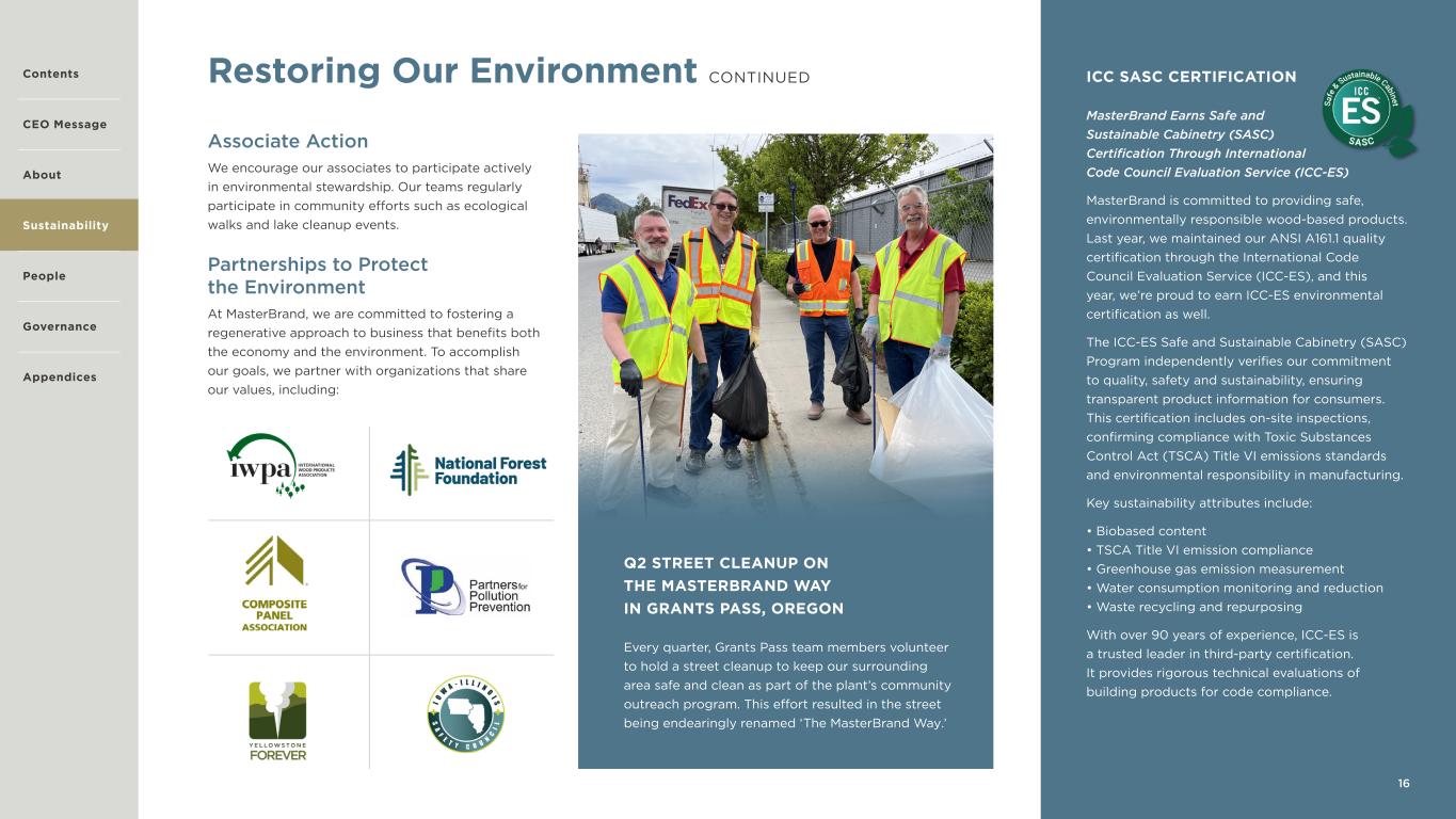 16 Restoring Our Environment CONTINUED Associate Action We encourage our associates to participate actively in environmental stewardship. Our teams regularly participate in community efforts such as ecological walks and lake cleanup events. Partnerships to Protect the Environment At MasterBrand, we are committed to fostering a regenerative approach to business that benefits both the economy and the environment. To accomplish our goals, we partner with organizations that share our values, including: Q2 STREET CLEANUP ON THE MASTERBRAND WAY IN GRANTS PASS, OREGON Every quarter, Grants Pass team members volunteer to hold a street cleanup to keep our surrounding area safe and clean as part of the plant’s community outreach program. This effort resulted in the street being endearingly renamed ‘The MasterBrand Way.’ ICC SASC CERTIFICATION MasterBrand Earns Safe and Sustainable Cabinetry (SASC) Certification Through International Code Council Evaluation Service (ICC-ES) MasterBrand is committed to providing safe, environmentally responsible wood-based products. Last year, we maintained our ANSI A161.1 quality certification through the International Code Council Evaluation Service (ICC-ES), and this year, we’re proud to earn ICC-ES environmental certification as well. The ICC-ES Safe and Sustainable Cabinetry (SASC) Program independently verifies our commitment to quality, safety and sustainability, ensuring transparent product information for consumers. This certification includes on-site inspections, confirming compliance with Toxic Substances Control Act (TSCA) Title VI emissions standards and environmental responsibility in manufacturing. Key sustainability attributes include: • Biobased content • TSCA Title VI emission compliance • Greenhouse gas emission measurement • Water consumption monitoring and reduction • Waste recycling and repurposing With over 90 years of experience, ICC-ES is a trusted leader in third-party certification. It provides rigorous technical evaluations of building products for code compliance. Contents CEO Message About Sustainability Governance Appendices People