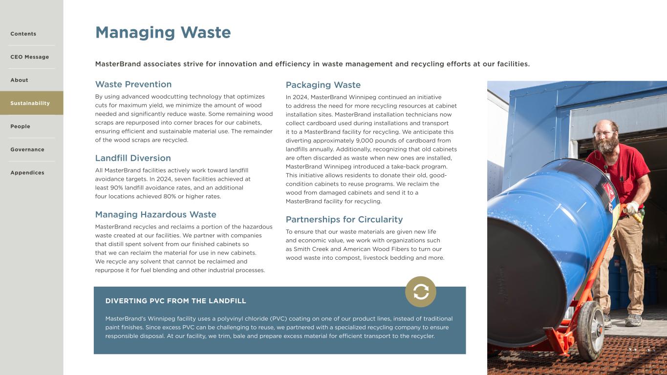 17 Managing Waste Waste Prevention By using advanced woodcutting technology that optimizes cuts for maximum yield, we minimize the amount of wood needed and significantly reduce waste. Some remaining wood scraps are repurposed into corner braces for our cabinets, ensuring efficient and sustainable material use. The remainder of the wood scraps are recycled. Landfill Diversion All MasterBrand facilities actively work toward landfill avoidance targets. In 2024, seven facilities achieved at least 90% landfill avoidance rates, and an additional four locations achieved 80% or higher rates. Managing Hazardous Waste MasterBrand recycles and reclaims a portion of the hazardous waste created at our facilities. We partner with companies that distill spent solvent from our finished cabinets so that we can reclaim the material for use in new cabinets. We recycle any solvent that cannot be reclaimed and repurpose it for fuel blending and other industrial processes. Packaging Waste In 2024, MasterBrand Winnipeg continued an initiative to address the need for more recycling resources at cabinet installation sites. MasterBrand installation technicians now collect cardboard used during installations and transport it to a MasterBrand facility for recycling. We anticipate this diverting approximately 9,000 pounds of cardboard from landfills annually. Additionally, recognizing that old cabinets are often discarded as waste when new ones are installed, MasterBrand Winnipeg introduced a take-back program. This initiative allows residents to donate their old, good- condition cabinets to reuse programs. We reclaim the wood from damaged cabinets and send it to a MasterBrand facility for recycling. Partnerships for Circularity To ensure that our waste materials are given new life and economic value, we work with organizations such as Smith Creek and American Wood Fibers to turn our wood waste into compost, livestock bedding and more. MasterBrand associates strive for innovation and efficiency in waste management and recycling efforts at our facilities. DIVERTING PVC FROM THE LANDFILL MasterBrand’s Winnipeg facility uses a polyvinyl chloride (PVC) coating on one of our product lines, instead of traditional paint finishes. Since excess PVC can be challenging to reuse, we partnered with a specialized recycling company to ensure responsible disposal. At our facility, we trim, bale and prepare excess material for efficient transport to the recycler. Contents CEO Message About Sustainability Governance Appendices People