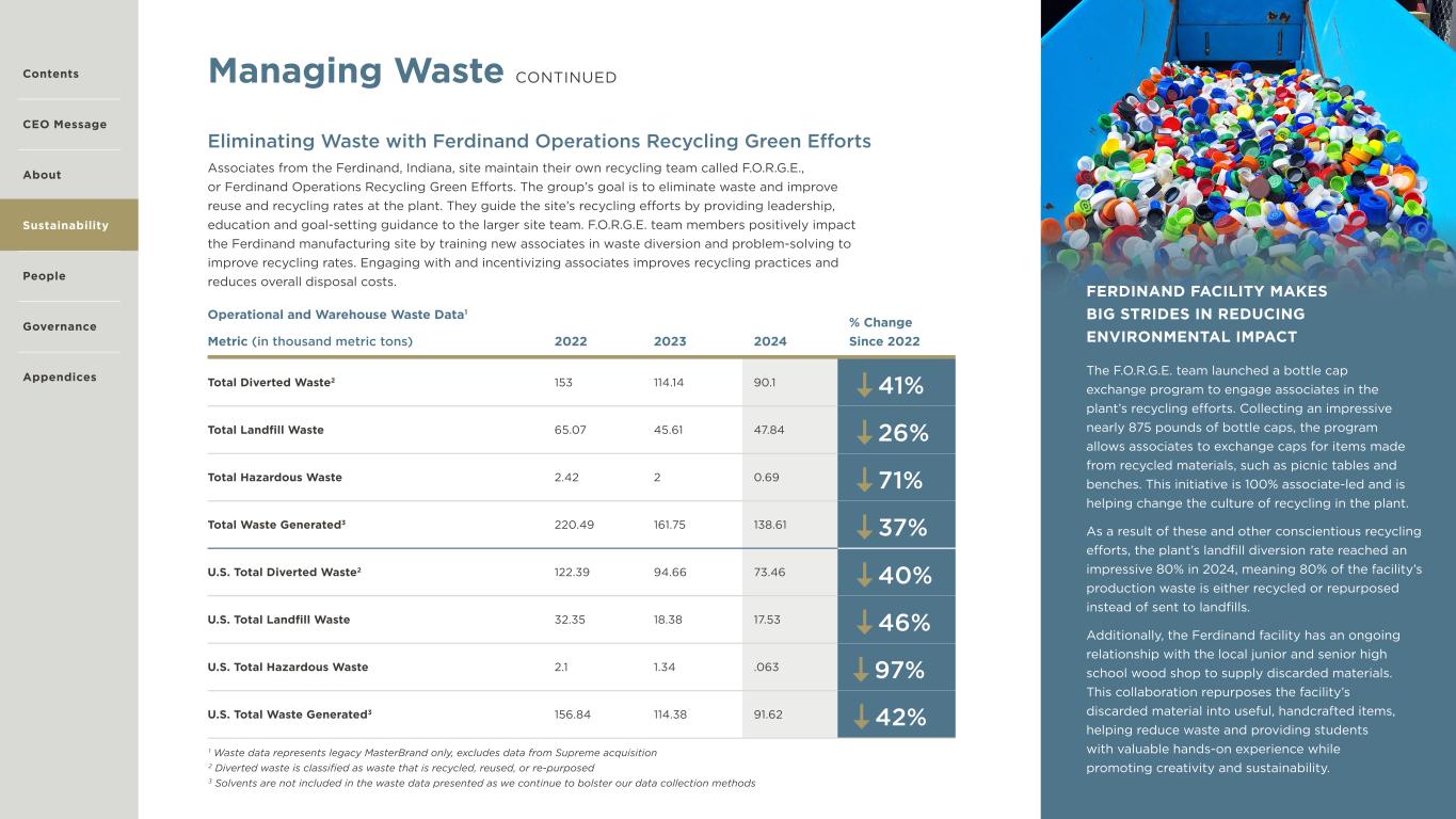18 Managing Waste CONTINUED Eliminating Waste with Ferdinand Operations Recycling Green Efforts Associates from the Ferdinand, Indiana, site maintain their own recycling team called F.O.R.G.E., or Ferdinand Operations Recycling Green Efforts. The group’s goal is to eliminate waste and improve reuse and recycling rates at the plant. They guide the site’s recycling efforts by providing leadership, education and goal-setting guidance to the larger site team. F.O.R.G.E. team members positively impact the Ferdinand manufacturing site by training new associates in waste diversion and problem-solving to improve recycling rates. Engaging with and incentivizing associates improves recycling practices and reduces overall disposal costs. Operational and Warehouse Waste Data1 Metric (in thousand metric tons) 2022 2023 2024 % Change Since 2022 Total Diverted Waste2 153 114.14 90.1 41% Total Landfill Waste 65.07 45.61 47.84 26% Total Hazardous Waste 2.42 2 0.69 71% Total Waste Generated3 220.49 161.75 138.61 37% U.S. Total Diverted Waste2 122.39 94.66 73.46 40% U.S. Total Landfill Waste 32.35 18.38 17.53 46% U.S. Total Hazardous Waste 2.1 1.34 .063 97% U.S. Total Waste Generated3 156.84 114.38 91.62 42% Contents CEO Message About Sustainability Governance Appendices 1 Waste data represents legacy MasterBrand only, excludes data from Supreme acquisition 2 Diverted waste is classified as waste that is recycled, reused, or re-purposed 3 Solvents are not included in the waste data presented as we continue to bolster our data collection methods People FERDINAND FACILITY MAKES BIG STRIDES IN REDUCING ENVIRONMENTAL IMPACT The F.O.R.G.E. team launched a bottle cap exchange program to engage associates in the plant’s recycling efforts. Collecting an impressive nearly 875 pounds of bottle caps, the program allows associates to exchange caps for items made from recycled materials, such as picnic tables and benches. This initiative is 100% associate-led and is helping change the culture of recycling in the plant. As a result of these and other conscientious recycling efforts, the plant’s landfill diversion rate reached an impressive 80% in 2024, meaning 80% of the facility’s production waste is either recycled or repurposed instead of sent to landfills. Additionally, the Ferdinand facility has an ongoing relationship with the local junior and senior high school wood shop to supply discarded materials. This collaboration repurposes the facility’s discarded material into useful, handcrafted items, helping reduce waste and providing students with valuable hands-on experience while promoting creativity and sustainability.