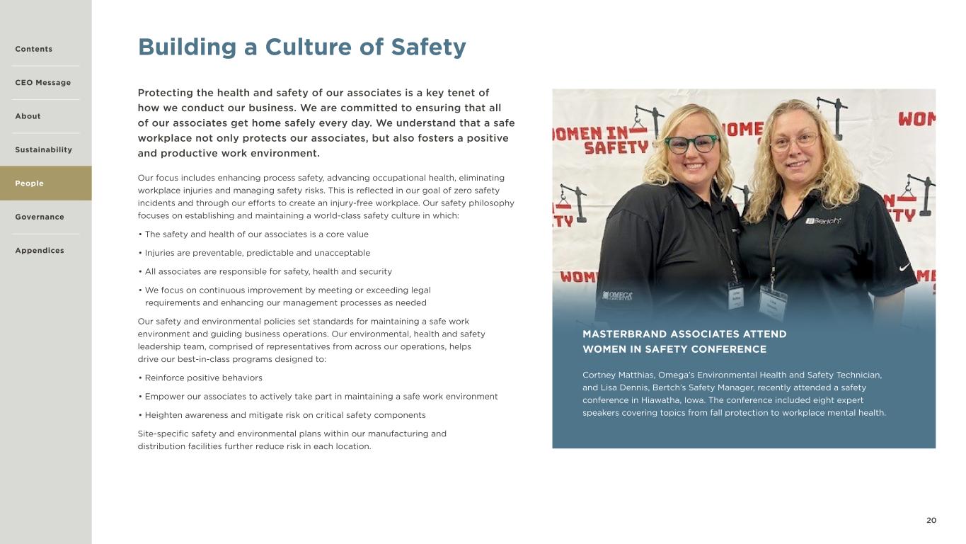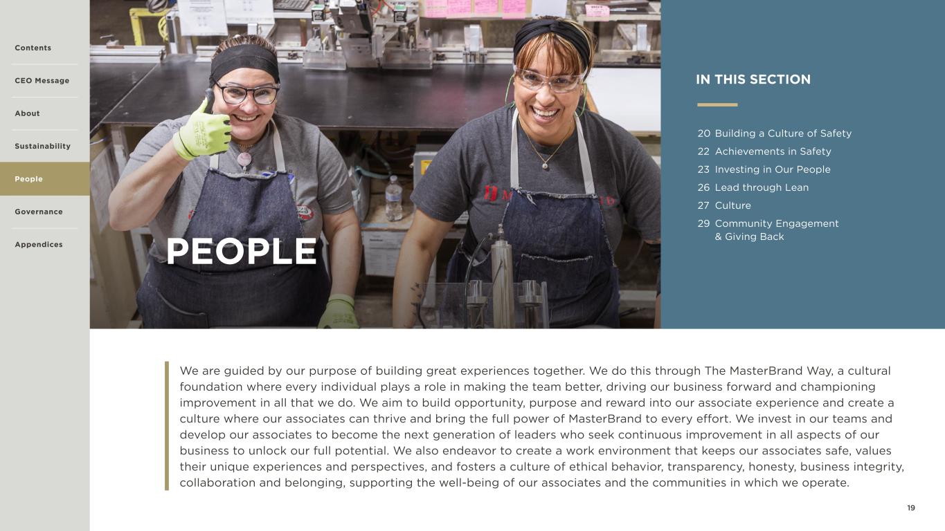 19 PEOPLE We are guided by our purpose of building great experiences together. We do this through The MasterBrand Way, a cultural foundation where every individual plays a role in making the team better, driving our business forward and championing improvement in all that we do. We aim to build opportunity, purpose and reward into our associate experience and create a culture where our associates can thrive and bring the full power of MasterBrand to every effort. We invest in our teams and develop our associates to become the next generation of leaders who seek continuous improvement in all aspects of our business to unlock our full potential. We also endeavor to create a work environment that keeps our associates safe, values their unique experiences and perspectives, and fosters a culture of ethical behavior, transparency, honesty, business integrity, collaboration and belonging, supporting the well-being of our associates and the communities in which we operate. IN THIS SECTION 20 Building a Culture of Safety 22 Achievements in Safety 23 Investing in Our People 26 Lead through Lean 27 Culture 29 Community Engagement & Giving Back Contents CEO Message About Sustainability Governance Appendices People