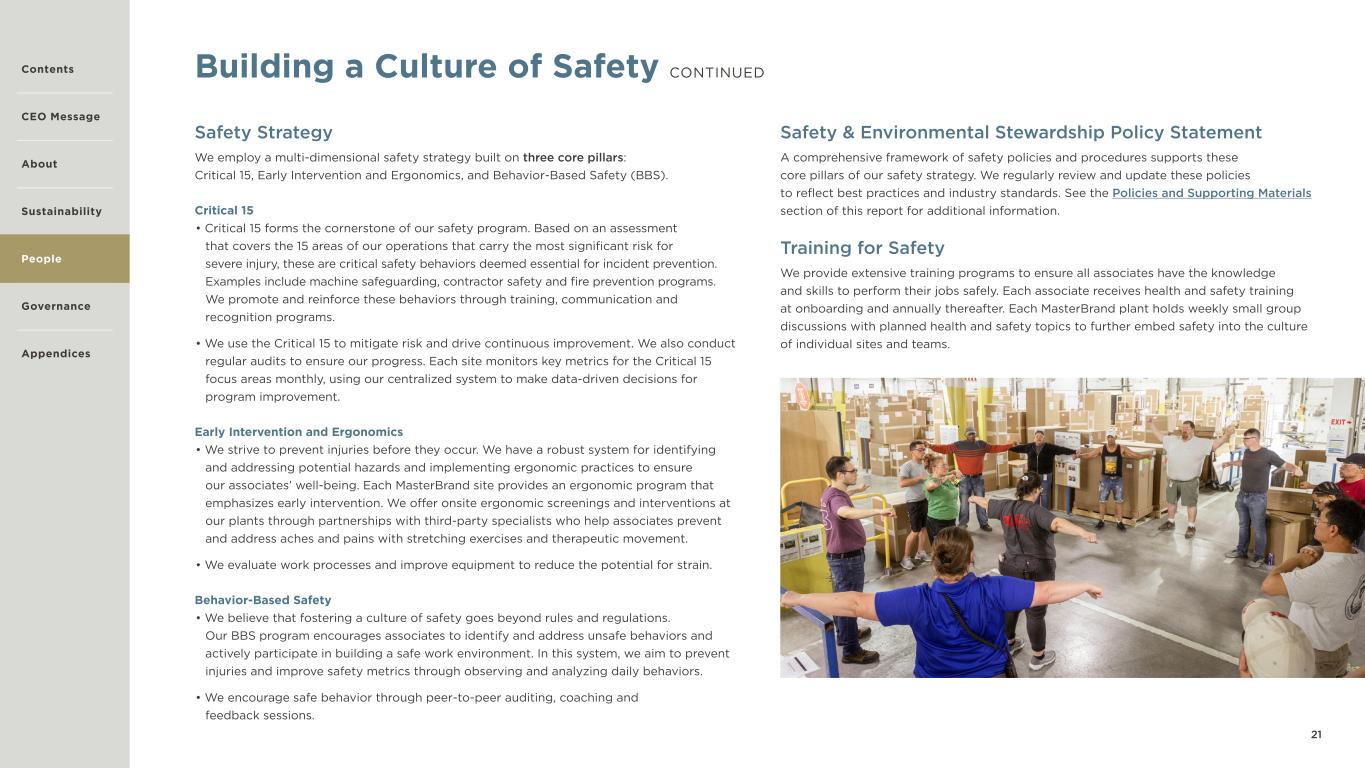 21 Safety Strategy We employ a multi-dimensional safety strategy built on three core pillars: Critical 15, Early Intervention and Ergonomics, and Behavior-Based Safety (BBS). Critical 15 • Critical 15 forms the cornerstone of our safety program. Based on an assessment that covers the 15 areas of our operations that carry the most significant risk for severe injury, these are critical safety behaviors deemed essential for incident prevention. Examples include machine safeguarding, contractor safety and fire prevention programs. We promote and reinforce these behaviors through training, communication and recognition programs. • We use the Critical 15 to mitigate risk and drive continuous improvement. We also conduct regular audits to ensure our progress. Each site monitors key metrics for the Critical 15 focus areas monthly, using our centralized system to make data-driven decisions for program improvement. Early Intervention and Ergonomics • We strive to prevent injuries before they occur. We have a robust system for identifying and addressing potential hazards and implementing ergonomic practices to ensure our associates’ well-being. Each MasterBrand site provides an ergonomic program that emphasizes early intervention. We offer onsite ergonomic screenings and interventions at our plants through partnerships with third-party specialists who help associates prevent and address aches and pains with stretching exercises and therapeutic movement. • We evaluate work processes and improve equipment to reduce the potential for strain. Behavior-Based Safety • We believe that fostering a culture of safety goes beyond rules and regulations. Our BBS program encourages associates to identify and address unsafe behaviors and actively participate in building a safe work environment. In this system, we aim to prevent injuries and improve safety metrics through observing and analyzing daily behaviors. • We encourage safe behavior through peer-to-peer auditing, coaching and feedback sessions. Building a Culture of Safety CONTINUED Safety & Environmental Stewardship Policy Statement A comprehensive framework of safety policies and procedures supports these core pillars of our safety strategy. We regularly review and update these policies to reflect best practices and industry standards. See the Policies and Supporting Materials section of this report for additional information. Training for Safety We provide extensive training programs to ensure all associates have the knowledge and skills to perform their jobs safely. Each associate receives health and safety training at onboarding and annually thereafter. Each MasterBrand plant holds weekly small group discussions with planned health and safety topics to further embed safety into the culture of individual sites and teams. Contents CEO Message About Sustainability Governance Appendices People