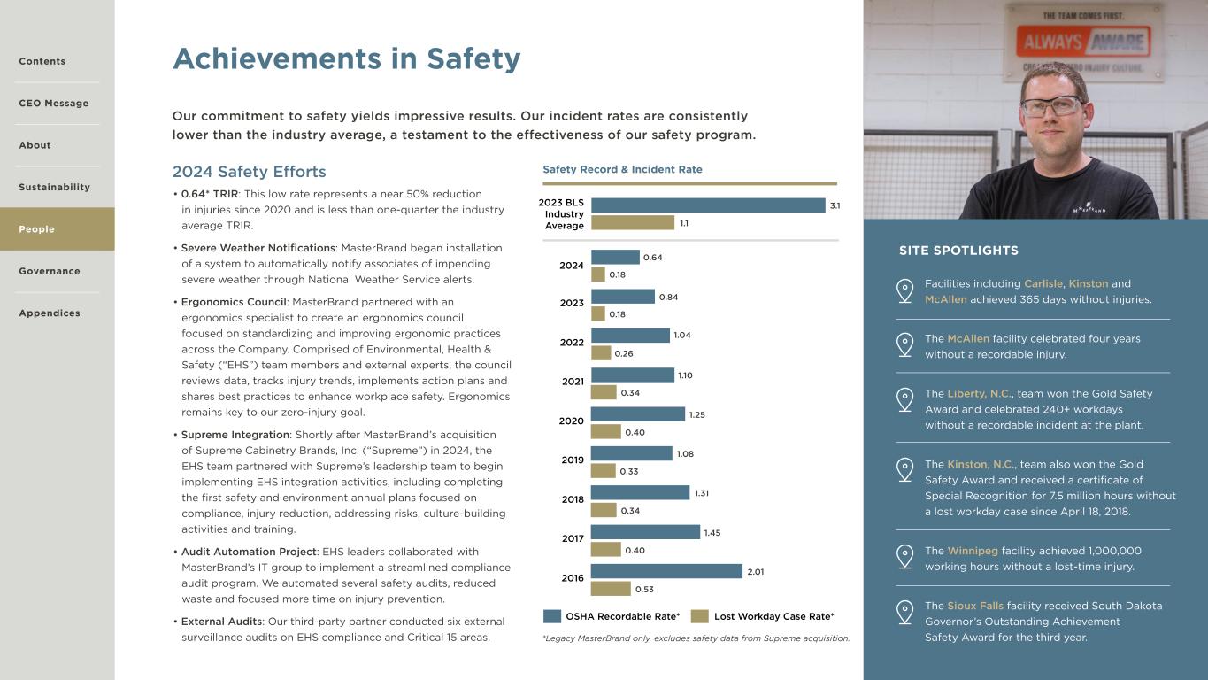 22 Achievements in Safety 2024 Safety Efforts • 0.64* TRIR: This low rate represents a near 50% reduction in injuries since 2020 and is less than one-quarter the industry average TRIR. • Severe Weather Notifications: MasterBrand began installation of a system to automatically notify associates of impending severe weather through National Weather Service alerts. • Ergonomics Council: MasterBrand partnered with an ergonomics specialist to create an ergonomics council focused on standardizing and improving ergonomic practices across the Company. Comprised of Environmental, Health & Safety (“EHS”) team members and external experts, the council reviews data, tracks injury trends, implements action plans and shares best practices to enhance workplace safety. Ergonomics remains key to our zero-injury goal. • Supreme Integration: Shortly after MasterBrand’s acquisition of Supreme Cabinetry Brands, Inc. (“Supreme”) in 2024, the EHS team partnered with Supreme’s leadership team to begin implementing EHS integration activities, including completing the first safety and environment annual plans focused on compliance, injury reduction, addressing risks, culture-building activities and training. • Audit Automation Project: EHS leaders collaborated with MasterBrand’s IT group to implement a streamlined compliance audit program. We automated several safety audits, reduced waste and focused more time on injury prevention. • External Audits: Our third-party partner conducted six external surveillance audits on EHS compliance and Critical 15 areas. Our commitment to safety yields impressive results. Our incident rates are consistently lower than the industry average, a testament to the effectiveness of our safety program. Facilities including Carlisle, Kinston and McAllen achieved 365 days without injuries. The McAllen facility celebrated four years without a recordable injury. The Liberty, N.C., team won the Gold Safety Award and celebrated 240+ workdays without a recordable incident at the plant. The Kinston, N.C., team also won the Gold Safety Award and received a certificate of Special Recognition for 7.5 million hours without a lost workday case since April 18, 2018. The Winnipeg facility achieved 1,000,000 working hours without a lost-time injury. The Sioux Falls facility received South Dakota Governor’s Outstanding Achievement Safety Award for the third year. SITE SPOTLIGHTS Contents CEO Message About Sustainability Governance Appendices *Legacy MasterBrand only, excludes safety data from Supreme acquisition. OSHA Recordable Rate* Lost Workday Case Rate* Safety Record & Incident Rate 2024 2023 BLS Industry Average 1.1 0.64 0.84 1.04 1.10 1.25 1.08 1.31 1.45 2.01 0.18 0.18 0.26 0.34 0.40 0.33 0.34 0.40 0.53 3.1 2023 2019 2021 2017 2022 2018 2020 2016 People
