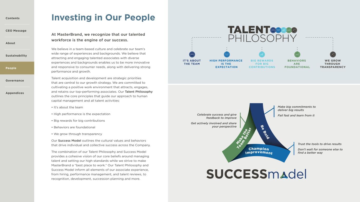 23 Investing in Our People We believe in a team-based culture and celebrate our team’s wide range of experiences and backgrounds. We believe that attracting and engaging talented associates with diverse experiences and backgrounds enables us to be more innovative and responsive to consumer needs, along with delivering strong performance and growth. Talent acquisition and development are strategic priorities that are central to our growth strategy. We are committed to cultivating a positive work environment that attracts, engages, and retains our top-performing associates. Our Talent Philosophy outlines the core principles that guide our approach to human capital management and all talent activities: • It’s about the team • High performance is the expectation • Big rewards for big contributions • Behaviors are foundational • We grow through transparency Our Success Model outlines the cultural values and behaviors that drive individual and collective success across the Company. The combination of our Talent Philosophy and Success Model provides a cohesive vision of our core beliefs around managing talent and setting our high standards while we strive to make MasterBrand a “best place to work.” Our Talent Philosophy and Success Model inform all elements of our associate experience, from hiring, performance management, and talent reviews, to recognition, development, succession planning and more. At MasterBrand, we recognize that our talented workforce is the engine of our success. Celebrate success and give feedback to improve Get actively involved and share your perspective Make big commitments to deliver big results Fail fast and learn from it Trust the tools to drive results Don’t wait for someone else to find a better way Contents CEO Message About Sustainability Governance Appendices People