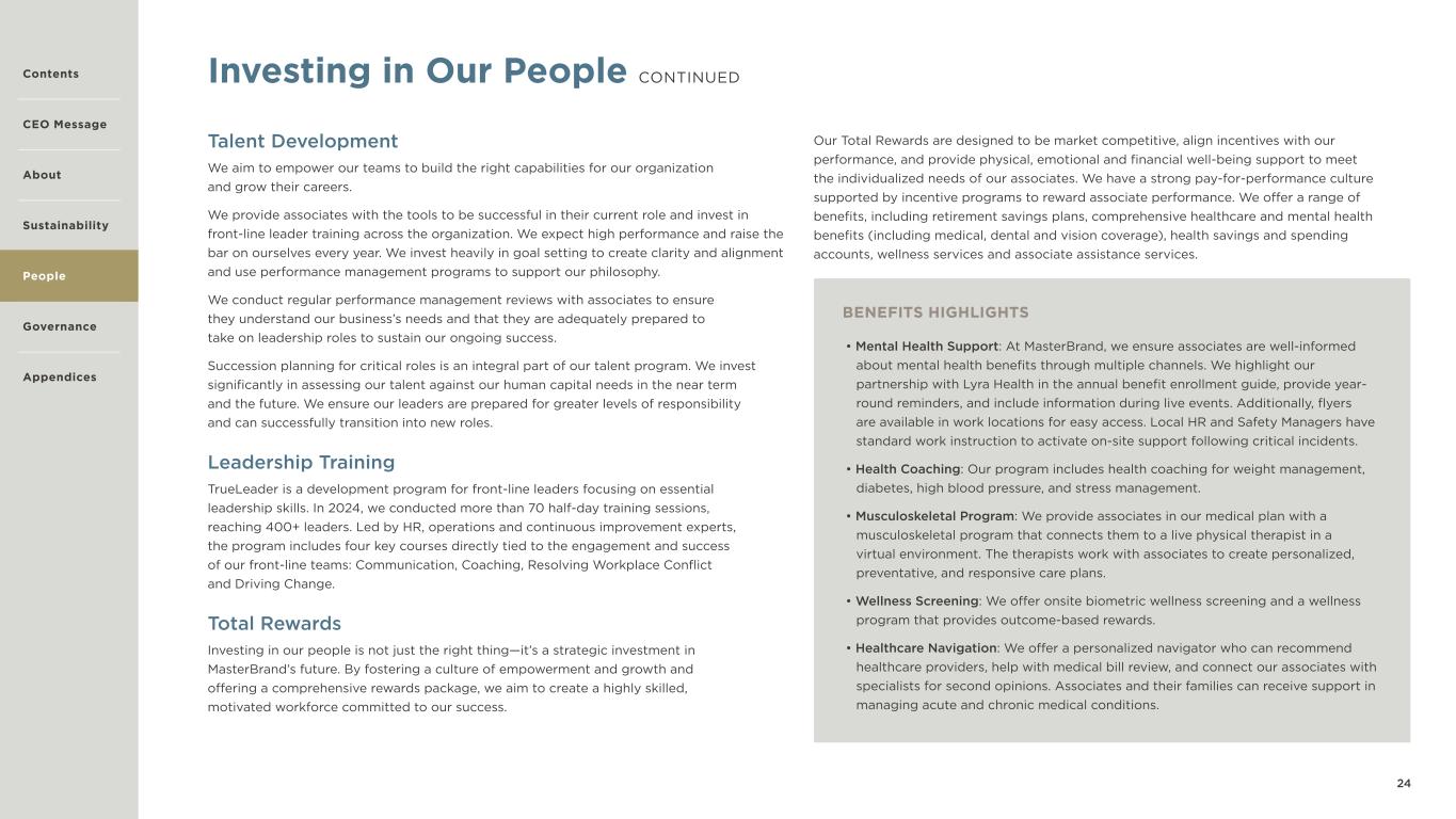 24 Investing in Our People CONTINUED Talent Development We aim to empower our teams to build the right capabilities for our organization and grow their careers. We provide associates with the tools to be successful in their current role and invest in front-line leader training across the organization. We expect high performance and raise the bar on ourselves every year. We invest heavily in goal setting to create clarity and alignment and use performance management programs to support our philosophy. We conduct regular performance management reviews with associates to ensure they understand our business’s needs and that they are adequately prepared to take on leadership roles to sustain our ongoing success. Succession planning for critical roles is an integral part of our talent program. We invest significantly in assessing our talent against our human capital needs in the near term and the future. We ensure our leaders are prepared for greater levels of responsibility and can successfully transition into new roles. Leadership Training TrueLeader is a development program for front-line leaders focusing on essential leadership skills. In 2024, we conducted more than 70 half-day training sessions, reaching 400+ leaders. Led by HR, operations and continuous improvement experts, the program includes four key courses directly tied to the engagement and success of our front-line teams: Communication, Coaching, Resolving Workplace Conflict and Driving Change. Total Rewards Investing in our people is not just the right thing—it’s a strategic investment in MasterBrand’s future. By fostering a culture of empowerment and growth and offering a comprehensive rewards package, we aim to create a highly skilled, motivated workforce committed to our success. Our Total Rewards are designed to be market competitive, align incentives with our performance, and provide physical, emotional and financial well-being support to meet the individualized needs of our associates. We have a strong pay-for-performance culture supported by incentive programs to reward associate performance. We offer a range of benefits, including retirement savings plans, comprehensive healthcare and mental health benefits (including medical, dental and vision coverage), health savings and spending accounts, wellness services and associate assistance services. BENEFITS HIGHLIGHTS • Mental Health Support: At MasterBrand, we ensure associates are well-informed about mental health benefits through multiple channels. We highlight our partnership with Lyra Health in the annual benefit enrollment guide, provide year- round reminders, and include information during live events. Additionally, flyers are available in work locations for easy access. Local HR and Safety Managers have standard work instruction to activate on-site support following critical incidents. • Health Coaching: Our program includes health coaching for weight management, diabetes, high blood pressure, and stress management. • Musculoskeletal Program: We provide associates in our medical plan with a musculoskeletal program that connects them to a live physical therapist in a virtual environment. The therapists work with associates to create personalized, preventative, and responsive care plans. • Wellness Screening: We offer onsite biometric wellness screening and a wellness program that provides outcome-based rewards. • Healthcare Navigation: We offer a personalized navigator who can recommend healthcare providers, help with medical bill review, and connect our associates with specialists for second opinions. Associates and their families can receive support in managing acute and chronic medical conditions. Contents CEO Message About Sustainability Governance Appendices People