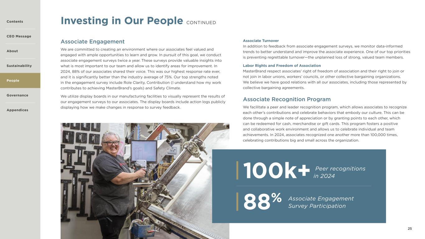 25 Investing in Our People CONTINUED Associate Engagement We are committed to creating an environment where our associates feel valued and engaged with ample opportunities to learn and grow. In pursuit of this goal, we conduct associate engagement surveys twice a year. These surveys provide valuable insights into what is most important to our team and allow us to identify areas for improvement. In 2024, 88% of our associates shared their voice. This was our highest response rate ever, and it is significantly better than the industry average of 75%. Our top strengths noted in the engagement survey include Role Clarity, Contribution (I understand how my work contributes to achieving MasterBrand’s goals) and Safety Climate. We utilize display boards in our manufacturing facilities to visually represent the results of our engagement surveys to our associates. The display boards include action logs publicly displaying how we make changes in response to survey feedback. Associate Turnover In addition to feedback from associate engagement surveys, we monitor data-informed trends to better understand and improve the associate experience. One of our top priorities is preventing regrettable turnover—the unplanned loss of strong, valued team members. Labor Rights and Freedom of Association MasterBrand respect associates’ right of freedom of association and their right to join or not join in labor unions, workers’ councils, or other collective bargaining organizations. We believe we have good relations with all our associates, including those represented by collective bargaining agreements. Associate Recognition Program We facilitate a peer and leader recognition program, which allows associates to recognize each other’s contributions and celebrate behaviors that embody our culture. This can be done through a simple note of appreciation or by granting points to each other, which can be redeemed for cash, merchandise or gift cards. This program fosters a positive and collaborative work environment and allows us to celebrate individual and team achievements. In 2024, associates recognized one another more than 100,000 times, celebrating contributions big and small across the organization. Contents CEO Message About Sustainability Governance Appendices Peer recognitions in 2024100k+ Associate Engagement Survey Participation88% People