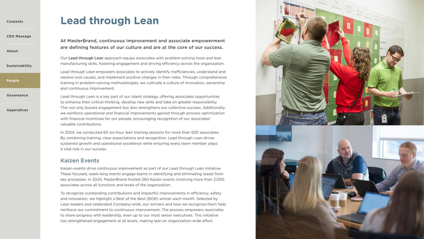 26 Lead through Lean Our Lead through Lean approach equips associates with problem-solving tools and lean manufacturing skills, fostering engagement and driving efficiency across the organization. Lead through Lean empowers associates to actively identify inefficiencies, understand and resolve root causes, and implement positive changes in their roles. Through comprehensive training in problem-solving methodologies, we cultivate a culture of innovation, ownership and continuous improvement. Lead through Lean is a key part of our talent strategy, offering associates opportunities to enhance their critical thinking, develop new skills and take on greater responsibility. This not only boosts engagement but also strengthens our collective success. Additionally, we reinforce operational and financial improvements gained through process optimization with financial incentives for our people, encouraging recognition of our associates’ valuable contributions. In 2024, we conducted 60 six-hour lean training sessions for more than 500 associates. By combining training, clear expectations and recognition, Lead through Lean drives sustained growth and operational excellence while ensuring every team member plays a vital role in our success. Kaizen Events Kaizen events drive continuous improvement as part of our Lead through Lean initiative. These focused, week-long events engage teams in identifying and eliminating waste from key processes. In 2024, MasterBrand hosted 260 Kaizen events involving more than 2,000 associates across all functions and levels of the organization. To recognize outstanding contributions and impactful improvements in efficiency, safety and innovation, we highlight a Best of the Best (BOB) winner each month. Selected by Lean leaders and celebrated Company-wide, our winners and how we recognize them help reinforce our commitment to continuous improvement. The process empowers associates to share progress with leadership, even up to our most senior executives. This initiative has strengthened engagement at all levels, making lean an organization-wide effort. At MasterBrand, continuous improvement and associate empowerment are defining features of our culture and are at the core of our success. Contents CEO Message About Sustainability Governance Appendices People