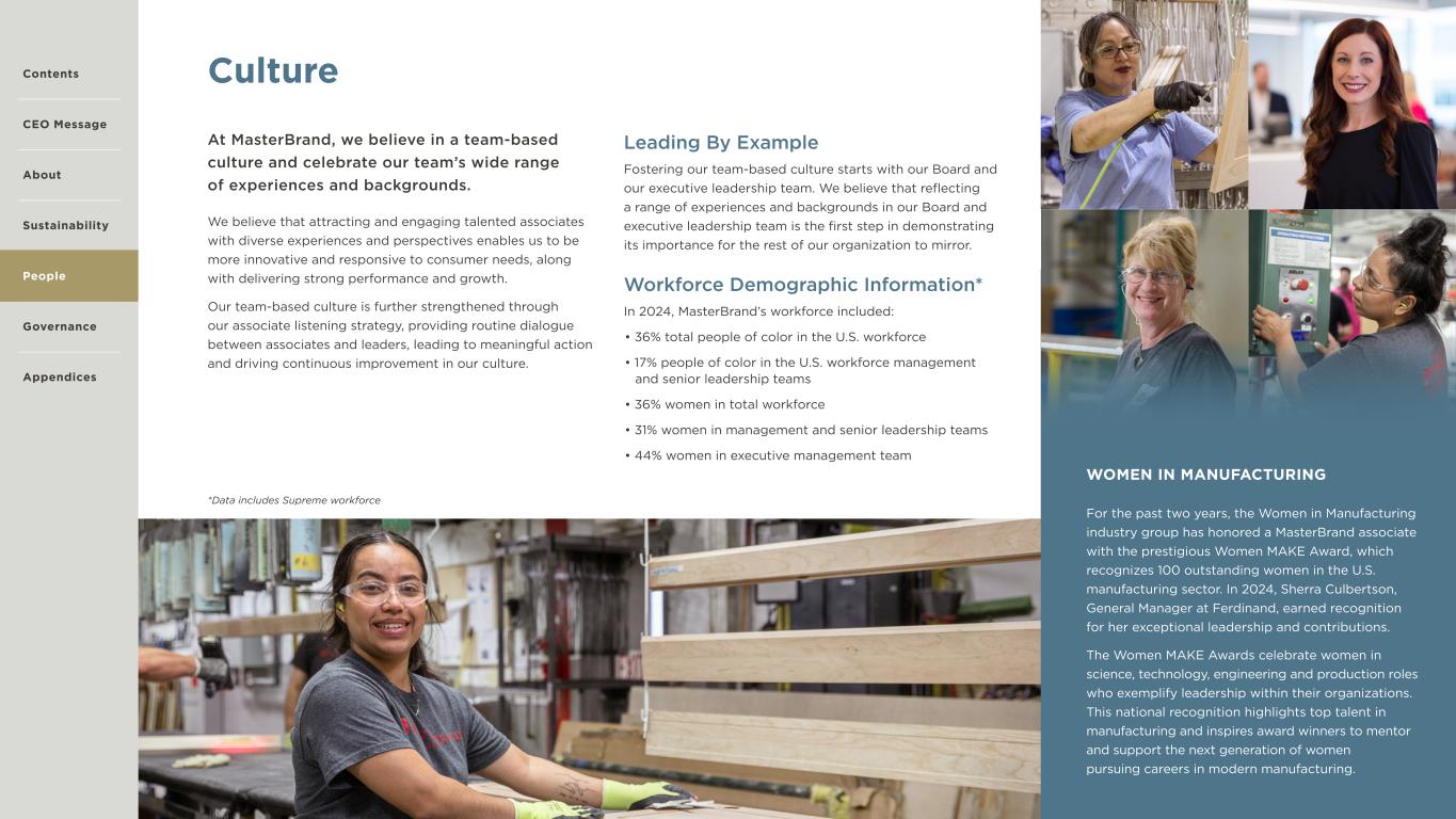 27 Culture We believe that attracting and engaging talented associates with diverse experiences and perspectives enables us to be more innovative and responsive to consumer needs, along with delivering strong performance and growth. Our team-based culture is further strengthened through our associate listening strategy, providing routine dialogue between associates and leaders, leading to meaningful action and driving continuous improvement in our culture. At MasterBrand, we believe in a team-based culture and celebrate our team’s wide range of experiences and backgrounds. Leading By Example Fostering our team-based culture starts with our Board and our executive leadership team. We believe that reflecting a range of experiences and backgrounds in our Board and executive leadership team is the first step in demonstrating its importance for the rest of our organization to mirror. Workforce Demographic Information* In 2024, MasterBrand’s workforce included: • 36% total people of color in the U.S. workforce • 17% people of color in the U.S. workforce management and senior leadership teams • 36% women in total workforce • 31% women in management and senior leadership teams • 44% women in executive management team WOMEN IN MANUFACTURING For the past two years, the Women in Manufacturing industry group has honored a MasterBrand associate with the prestigious Women MAKE Award, which recognizes 100 outstanding women in the U.S. manufacturing sector. In 2024, Sherra Culbertson, General Manager at Ferdinand, earned recognition for her exceptional leadership and contributions. The Women MAKE Awards celebrate women in science, technology, engineering and production roles who exemplify leadership within their organizations. This national recognition highlights top talent in manufacturing and inspires award winners to mentor and support the next generation of women pursuing careers in modern manufacturing. Contents CEO Message About Sustainability Governance Appendices People *Data includes Supreme workforce
