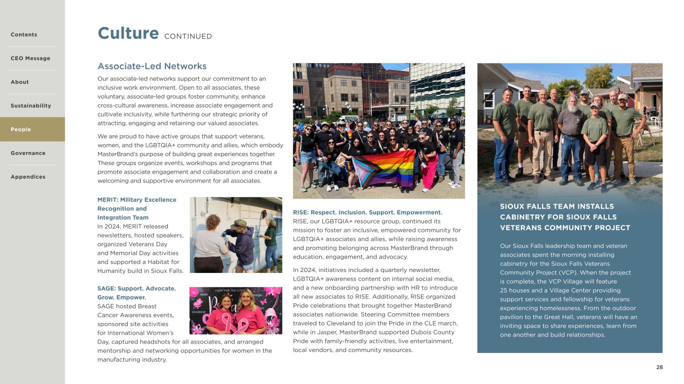 28 RISE: Respect. Inclusion. Support. Empowerment. RISE, our LGBTQIA+ resource group, continued its mission to foster an inclusive, empowered community for LGBTQIA+ associates and allies, while raising awareness and promoting belonging across MasterBrand through education, engagement, and advocacy. In 2024, initiatives included a quarterly newsletter, LGBTQIA+ awareness content on internal social media, and a new onboarding partnership with HR to introduce all new associates to RISE. Additionally, RISE organized Pride celebrations that brought together MasterBrand associates nationwide. Steering Committee members traveled to Cleveland to join the Pride in the CLE march, while in Jasper, MasterBrand supported Dubois County Pride with family-friendly activities, live entertainment, local vendors, and community resources. Culture CONTINUED Associate-Led Networks Our associate-led networks support our commitment to an inclusive work environment. Open to all associates, these voluntary, associate-led groups foster community, enhance cross-cultural awareness, increase associate engagement and cultivate inclusivity, while furthering our strategic priority of attracting, engaging and retaining our valued associates. We are proud to have active groups that support veterans, women, and the LGBTQIA+ community and allies, which embody MasterBrand’s purpose of building great experiences together. These groups organize events, workshops and programs that promote associate engagement and collaboration and create a welcoming and supportive environment for all associates. MERIT: Military Excellence Recognition and Integration Team In 2024, MERIT released newsletters, hosted speakers, organized Veterans Day and Memorial Day activities and supported a Habitat for Humanity build in Sioux Falls. SAGE: Support. Advocate. Grow. Empower. SAGE hosted Breast Cancer Awareness events, sponsored site activities for International Women’s Day, captured headshots for all associates, and arranged mentorship and networking opportunities for women in the manufacturing industry. SIOUX FALLS TEAM INSTALLS CABINETRY FOR SIOUX FALLS VETERANS COMMUNITY PROJECT Our Sioux Falls leadership team and veteran associates spent the morning installing cabinetry for the Sioux Falls Veterans Community Project (VCP). When the project is complete, the VCP Village will feature 25 houses and a Village Center providing support services and fellowship for veterans experiencing homelessness. From the outdoor pavilion to the Great Hall, veterans will have an inviting space to share experiences, learn from one another and build relationships. Contents CEO Message About Sustainability Governance Appendices People