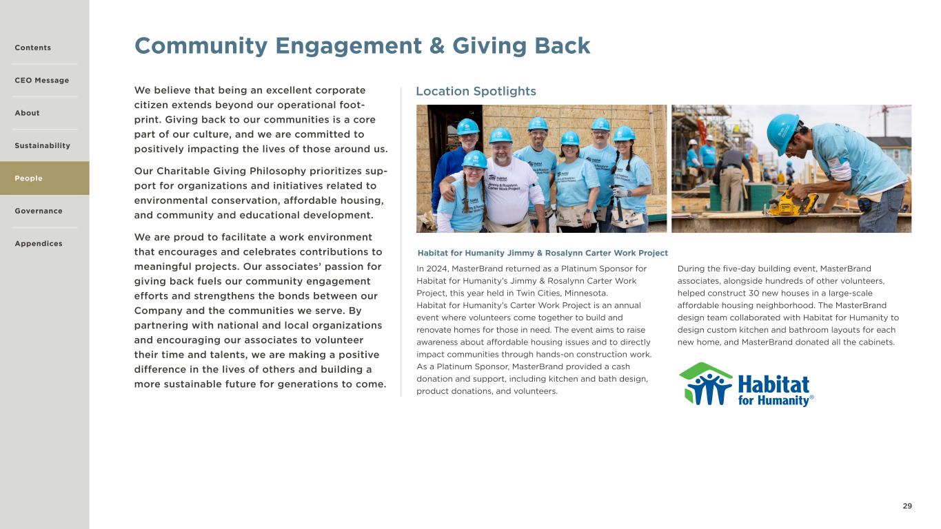 29 Community Engagement & Giving Back We believe that being an excellent corporate citizen extends beyond our operational foot- print. Giving back to our communities is a core part of our culture, and we are committed to positively impacting the lives of those around us. Our Charitable Giving Philosophy prioritizes sup- port for organizations and initiatives related to environmental conservation, affordable housing, and community and educational development. We are proud to facilitate a work environment that encourages and celebrates contributions to meaningful projects. Our associates’ passion for giving back fuels our community engagement efforts and strengthens the bonds between our Company and the communities we serve. By partnering with national and local organizations and encouraging our associates to volunteer their time and talents, we are making a positive difference in the lives of others and building a more sustainable future for generations to come. In 2024, MasterBrand returned as a Platinum Sponsor for Habitat for Humanity’s Jimmy & Rosalynn Carter Work Project, this year held in Twin Cities, Minnesota. Habitat for Humanity’s Carter Work Project is an annual event where volunteers come together to build and renovate homes for those in need. The event aims to raise awareness about affordable housing issues and to directly impact communities through hands-on construction work. As a Platinum Sponsor, MasterBrand provided a cash donation and support, including kitchen and bath design, product donations, and volunteers. Location Spotlights During the five-day building event, MasterBrand associates, alongside hundreds of other volunteers, helped construct 30 new houses in a large-scale affordable housing neighborhood. The MasterBrand design team collaborated with Habitat for Humanity to design custom kitchen and bathroom layouts for each new home, and MasterBrand donated all the cabinets. Habitat for Humanity Jimmy & Rosalynn Carter Work Project Contents CEO Message About Sustainability Governance Appendices People