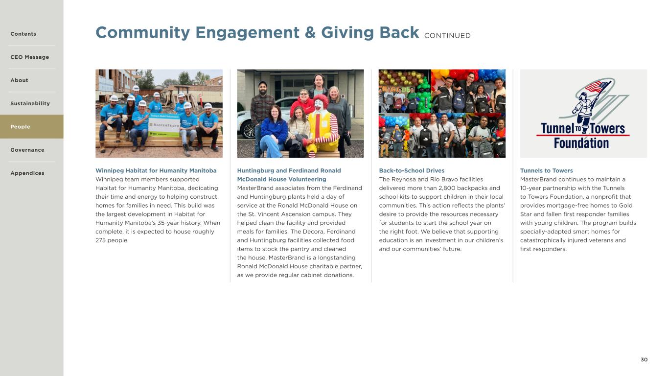 30 Tunnels to Towers MasterBrand continues to maintain a 10-year partnership with the Tunnels to Towers Foundation, a nonprofit that provides mortgage-free homes to Gold Star and fallen first responder families with young children. The program builds specially-adapted smart homes for catastrophically injured veterans and first responders. Winnipeg Habitat for Humanity Manitoba Winnipeg team members supported Habitat for Humanity Manitoba, dedicating their time and energy to helping construct homes for families in need. This build was the largest development in Habitat for Humanity Manitoba’s 35-year history. When complete, it is expected to house roughly 275 people. Huntingburg and Ferdinand Ronald McDonald House Volunteering MasterBrand associates from the Ferdinand and Huntingburg plants held a day of service at the Ronald McDonald House on the St. Vincent Ascension campus. They helped clean the facility and provided meals for families. The Decora, Ferdinand and Huntingburg facilities collected food items to stock the pantry and cleaned the house. MasterBrand is a longstanding Ronald McDonald House charitable partner, as we provide regular cabinet donations. Community Engagement & Giving Back CONTINUED Back-to-School Drives The Reynosa and Rio Bravo facilities delivered more than 2,800 backpacks and school kits to support children in their local communities. This action reflects the plants’ desire to provide the resources necessary for students to start the school year on the right foot. We believe that supporting education is an investment in our children’s and our communities’ future. Contents CEO Message About Sustainability Governance Appendices People
