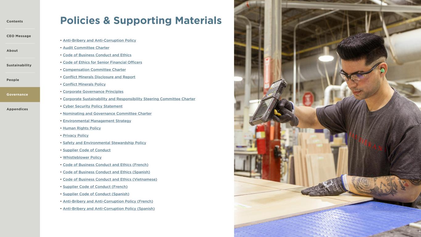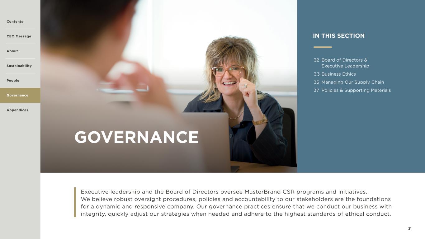 31 GOVERNANCE Executive leadership and the Board of Directors oversee MasterBrand CSR programs and initiatives. We believe robust oversight procedures, policies and accountability to our stakeholders are the foundations for a dynamic and responsive company. Our governance practices ensure that we conduct our business with integrity, quickly adjust our strategies when needed and adhere to the highest standards of ethical conduct. IN THIS SECTION 32 Board of Directors & Executive Leadership 33 Business Ethics 35 Managing Our Supply Chain 37 Policies & Supporting Materials Contents CEO Message About Sustainability Appendices Governance People