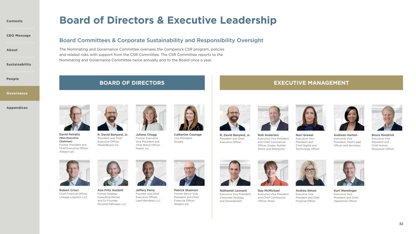 32 Board of Directors & Executive Leadership Board Committees & Corporate Sustainability and Responsibility Oversight The Nominating and Governance Committee oversees the Company’s CSR program, policies and related risks with support from the CSR Committee. The CSR Committee reports to the Nominating and Governance Committee twice annually and to the Board once a year. R. David Banyard, Jr. President and Chief Executive Officer, MasterBrand, Inc. Ann Fritz Hackett Former Strategy Consulting Partner and Co-Founder, Personal Pathways, LLC Jeffery Perry Founder and Chief Executive Officer, Lead Mandates LLC Patrick Shannon Former Senior Vice President and Chief Financial Officer, Allegion plc David Petratis (Non-Executive Chairman) Former President and Chief Executive Officer, Allegion plc Juliana Chugg Former Executive Vice President and Chief Brand Officer, Mattel, Inc. Catherine Courage Vice President, Google Robert Crisci Chief Financial Officer, Lineage Logistics, LLC BOARD OF DIRECTORS Andrean Horton Executive Vice President, Chief Legal Officer and Secretary Bruce Kendrick Executive Vice President and Chief Human Resources Officer Nathaniel Leonard Executive Vice President, Corporate Strategy and Development Kurt Wanninger Executive Vice President and Chief Operations Officer Rob Andersen Executive Vice President and Chief Commercial Officer, Dealer, Builder Direct and Distributor Navi Grewal Executive Vice President and Chief Digital and Technology Officer Gay McMichael Executive Vice President and Chief Commercial Officer, Retail Andrea Simon Executive Vice President and Chief Financial Officer R. David Banyard, Jr. President and Chief Executive Officer EXECUTIVE MANAGEMENT Contents CEO Message About Sustainability Appendices Governance People