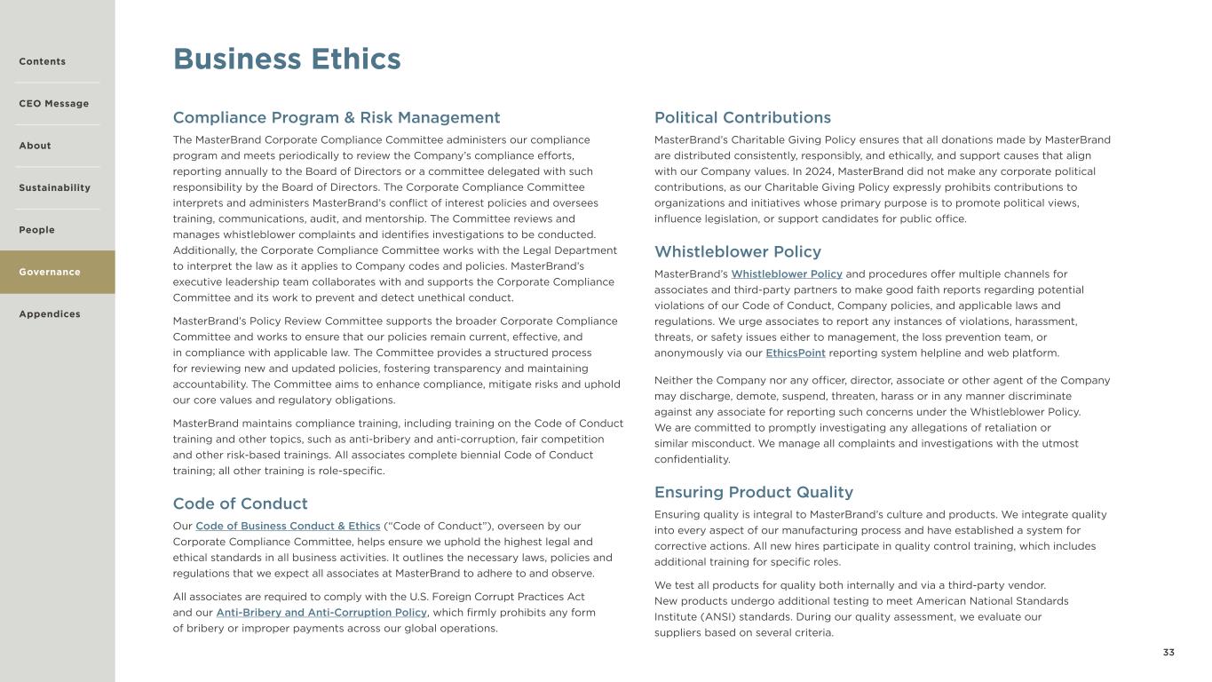 33 Business Ethics Compliance Program & Risk Management The MasterBrand Corporate Compliance Committee administers our compliance program and meets periodically to review the Company’s compliance efforts, reporting annually to the Board of Directors or a committee delegated with such responsibility by the Board of Directors. The Corporate Compliance Committee interprets and administers MasterBrand’s conflict of interest policies and oversees training, communications, audit, and mentorship. The Committee reviews and manages whistleblower complaints and identifies investigations to be conducted. Additionally, the Corporate Compliance Committee works with the Legal Department to interpret the law as it applies to Company codes and policies. MasterBrand’s executive leadership team collaborates with and supports the Corporate Compliance Committee and its work to prevent and detect unethical conduct. MasterBrand’s Policy Review Committee supports the broader Corporate Compliance Committee and works to ensure that our policies remain current, effective, and in compliance with applicable law. The Committee provides a structured process for reviewing new and updated policies, fostering transparency and maintaining accountability. The Committee aims to enhance compliance, mitigate risks and uphold our core values and regulatory obligations. MasterBrand maintains compliance training, including training on the Code of Conduct training and other topics, such as anti-bribery and anti-corruption, fair competition and other risk-based trainings. All associates complete biennial Code of Conduct training; all other training is role-specific. Code of Conduct Our Code of Business Conduct & Ethics (“Code of Conduct”), overseen by our Corporate Compliance Committee, helps ensure we uphold the highest legal and ethical standards in all business activities. It outlines the necessary laws, policies and regulations that we expect all associates at MasterBrand to adhere to and observe. All associates are required to comply with the U.S. Foreign Corrupt Practices Act and our Anti-Bribery and Anti-Corruption Policy, which firmly prohibits any form of bribery or improper payments across our global operations. Political Contributions MasterBrand’s Charitable Giving Policy ensures that all donations made by MasterBrand are distributed consistently, responsibly, and ethically, and support causes that align with our Company values. In 2024, MasterBrand did not make any corporate political contributions, as our Charitable Giving Policy expressly prohibits contributions to organizations and initiatives whose primary purpose is to promote political views, influence legislation, or support candidates for public office. Whistleblower Policy MasterBrand’s Whistleblower Policy and procedures offer multiple channels for associates and third-party partners to make good faith reports regarding potential violations of our Code of Conduct, Company policies, and applicable laws and regulations. We urge associates to report any instances of violations, harassment, threats, or safety issues either to management, the loss prevention team, or anonymously via our EthicsPoint reporting system helpline and web platform. Neither the Company nor any officer, director, associate or other agent of the Company may discharge, demote, suspend, threaten, harass or in any manner discriminate against any associate for reporting such concerns under the Whistleblower Policy. We are committed to promptly investigating any allegations of retaliation or similar misconduct. We manage all complaints and investigations with the utmost confidentiality. Ensuring Product Quality Ensuring quality is integral to MasterBrand’s culture and products. We integrate quality into every aspect of our manufacturing process and have established a system for corrective actions. All new hires participate in quality control training, which includes additional training for specific roles. We test all products for quality both internally and via a third-party vendor. New products undergo additional testing to meet American National Standards Institute (ANSI) standards. During our quality assessment, we evaluate our suppliers based on several criteria. Contents CEO Message About Sustainability Appendices Governance People