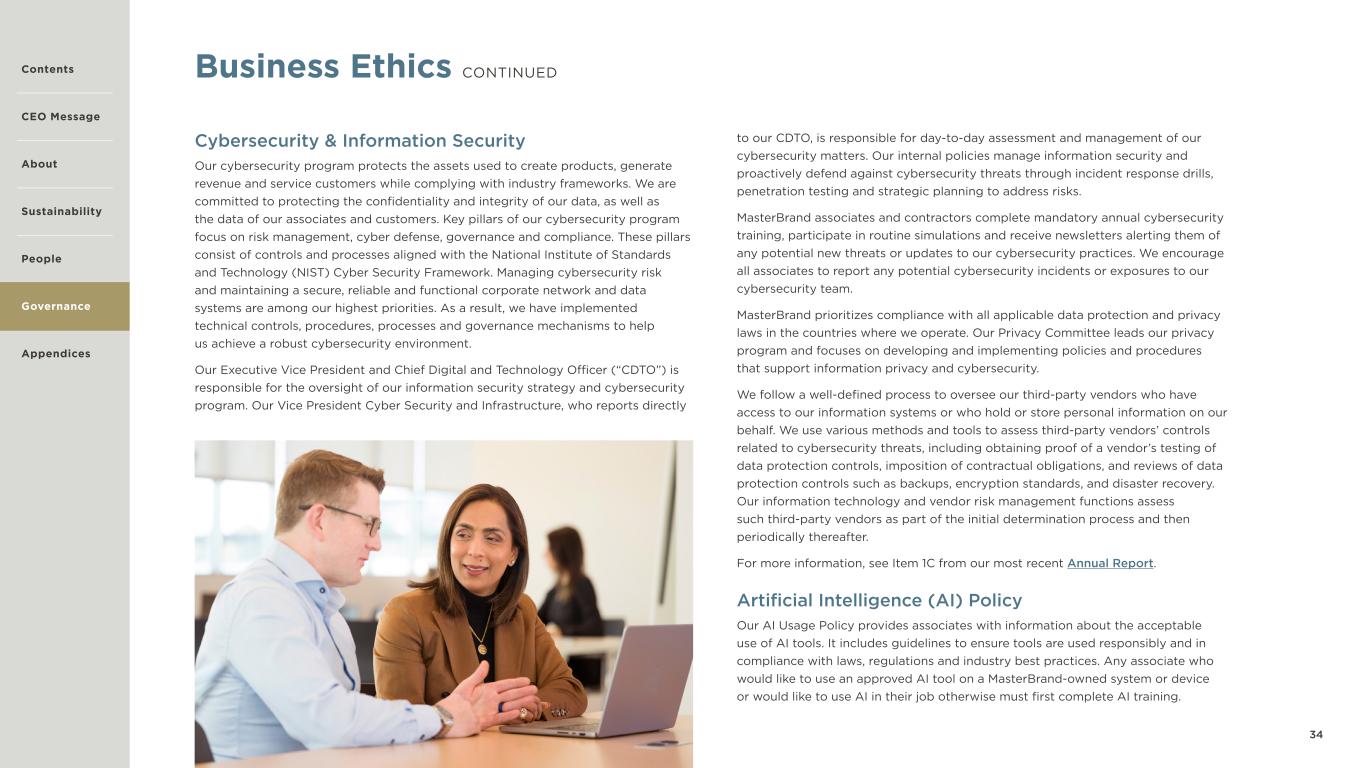 34 Business Ethics CONTINUED Cybersecurity & Information Security Our cybersecurity program protects the assets used to create products, generate revenue and service customers while complying with industry frameworks. We are committed to protecting the confidentiality and integrity of our data, as well as the data of our associates and customers. Key pillars of our cybersecurity program focus on risk management, cyber defense, governance and compliance. These pillars consist of controls and processes aligned with the National Institute of Standards and Technology (NIST) Cyber Security Framework. Managing cybersecurity risk and maintaining a secure, reliable and functional corporate network and data systems are among our highest priorities. As a result, we have implemented technical controls, procedures, processes and governance mechanisms to help us achieve a robust cybersecurity environment. Our Executive Vice President and Chief Digital and Technology Officer (“CDTO”) is responsible for the oversight of our information security strategy and cybersecurity program. Our Vice President Cyber Security and Infrastructure, who reports directly to our CDTO, is responsible for day-to-day assessment and management of our cybersecurity matters. Our internal policies manage information security and proactively defend against cybersecurity threats through incident response drills, penetration testing and strategic planning to address risks. MasterBrand associates and contractors complete mandatory annual cybersecurity training, participate in routine simulations and receive newsletters alerting them of any potential new threats or updates to our cybersecurity practices. We encourage all associates to report any potential cybersecurity incidents or exposures to our cybersecurity team. MasterBrand prioritizes compliance with all applicable data protection and privacy laws in the countries where we operate. Our Privacy Committee leads our privacy program and focuses on developing and implementing policies and procedures that support information privacy and cybersecurity. We follow a well-defined process to oversee our third-party vendors who have access to our information systems or who hold or store personal information on our behalf. We use various methods and tools to assess third-party vendors’ controls related to cybersecurity threats, including obtaining proof of a vendor’s testing of data protection controls, imposition of contractual obligations, and reviews of data protection controls such as backups, encryption standards, and disaster recovery. Our information technology and vendor risk management functions assess such third-party vendors as part of the initial determination process and then periodically thereafter. For more information, see Item 1C from our most recent Annual Report. Artificial Intelligence (AI) Policy Our AI Usage Policy provides associates with information about the acceptable use of AI tools. It includes guidelines to ensure tools are used responsibly and in compliance with laws, regulations and industry best practices. Any associate who would like to use an approved AI tool on a MasterBrand-owned system or device or would like to use AI in their job otherwise must first complete AI training. Contents CEO Message About Sustainability Appendices Governance People