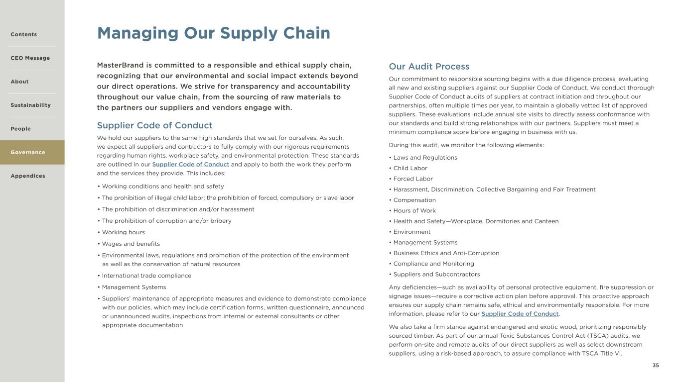35 Managing Our Supply Chain Supplier Code of Conduct We hold our suppliers to the same high standards that we set for ourselves. As such, we expect all suppliers and contractors to fully comply with our rigorous requirements regarding human rights, workplace safety, and environmental protection. These standards are outlined in our Supplier Code of Conduct and apply to both the work they perform and the services they provide. This includes: • Working conditions and health and safety • The prohibition of illegal child labor; the prohibition of forced, compulsory or slave labor • The prohibition of discrimination and/or harassment • The prohibition of corruption and/or bribery • Working hours • Wages and benefits • Environmental laws, regulations and promotion of the protection of the environment as well as the conservation of natural resources • International trade compliance • Management Systems • Suppliers’ maintenance of appropriate measures and evidence to demonstrate compliance with our policies, which may include certification forms, written questionnaire, announced or unannounced audits, inspections from internal or external consultants or other appropriate documentation Our Audit Process Our commitment to responsible sourcing begins with a due diligence process, evaluating all new and existing suppliers against our Supplier Code of Conduct. We conduct thorough Supplier Code of Conduct audits of suppliers at contract initiation and throughout our partnerships, often multiple times per year, to maintain a globally vetted list of approved suppliers. These evaluations include annual site visits to directly assess conformance with our standards and build strong relationships with our partners. Suppliers must meet a minimum compliance score before engaging in business with us. During this audit, we monitor the following elements: • Laws and Regulations • Child Labor • Forced Labor • Harassment, Discrimination, Collective Bargaining and Fair Treatment • Compensation • Hours of Work • Health and Safety—Workplace, Dormitories and Canteen • Environment • Management Systems • Business Ethics and Anti-Corruption • Compliance and Monitoring • Suppliers and Subcontractors Any deficiencies—such as availability of personal protective equipment, fire suppression or signage issues—require a corrective action plan before approval. This proactive approach ensures our supply chain remains safe, ethical and environmentally responsible. For more information, please refer to our Supplier Code of Conduct. We also take a firm stance against endangered and exotic wood, prioritizing responsibly sourced timber. As part of our annual Toxic Substances Control Act (TSCA) audits, we perform on-site and remote audits of our direct suppliers as well as select downstream suppliers, using a risk-based approach, to assure compliance with TSCA Title VI. MasterBrand is committed to a responsible and ethical supply chain, recognizing that our environmental and social impact extends beyond our direct operations. We strive for transparency and accountability throughout our value chain, from the sourcing of raw materials to the partners our suppliers and vendors engage with. Contents CEO Message About Sustainability Appendices Governance People