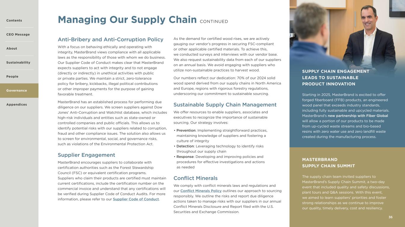 MASTERBRAND SUPPLY CHAIN SUMMIT The supply chain team invited suppliers to MasterBrand’s Supply Chain Summit, a two-day event that included quality and safety discussions, plant tours and Q&A sessions. With this event, we aimed to learn suppliers’ priorities and foster strong relationships as we continue to improve our quality, timely delivery, cost and resiliency. SUPPLY CHAIN ENGAGEMENT LEADS TO SUSTAINABLE PRODUCT INNOVATION Starting in 2025, MasterBrand is excited to offer forged fiberboard (FFB) products, an engineered wood panel that exceeds industry standards, including fully sustainable and upcycled materials. MasterBrand’s new partnership with Fiber Global will allow a portion of our products to be made from up-cycled waste streams and bio-based resins with zero water use and zero landfill waste created during the manufacturing process. 36 Managing Our Supply Chain CONTINUED Anti-Bribery and Anti-Corruption Policy With a focus on behaving ethically and operating with integrity, MasterBrand views compliance with all applicable laws as the responsibility of those with whom we do business. Our Supplier Code of Conduct makes clear that MasterBrand expects suppliers to act with integrity and to not engage (directly or indirectly) in unethical activities with public or private parties. We maintain a strict, zero-tolerance policy for bribery, kickbacks, illegal political contributions or other improper payments for the purpose of gaining favorable treatment. MasterBrand has an established process for performing due diligence on our suppliers. We screen suppliers against Dow Jones’ Anti-Corruption and Watchlist database, which includes high-risk individuals and entities such as state-owned or controlled companies and public officials. This allows us to identify potential risks with our suppliers related to corruption, fraud and other compliance issues. The solution also allows us to screen for environmental, social, and governance risks, such as violations of the Environmental Protection Act. Supplier Engagement MasterBrand encourages suppliers to collaborate with certification authorities such as the Forest Stewardship Council (FSC) or equivalent certification programs. Suppliers who claim their products are certified must maintain current certifications, include the certification number on the commercial invoice and understand that any certifications will be verified during Supplier Code of Conduct Audits. For more information, please refer to our Supplier Code of Conduct. As the demand for certified wood rises, we are actively gauging our vendor’s progress in securing FSC-compliant or other applicable certified materials. To achieve this, we conducted surveys and interviews with our vendor base. We also request sustainability data from each of our suppliers on an annual basis. We avoid engaging with suppliers who utilize non-sustainable practices to harvest wood. Our numbers reflect our dedication: 70% of our 2024 solid wood spend derived from our supply chains in North America and Europe, regions with rigorous forestry regulations, underscoring our commitment to sustainable sourcing. Sustainable Supply Chain Management We offer resources to enable suppliers, associates and executives to recognize the importance of sustainable sourcing. Our strategy involves: • Prevention: Implementing straightforward practices, maintaining knowledge of suppliers and fostering a culture of integrity • Detection: Leveraging technology to identify risks throughout our supply chain • Response: Developing and improving policies and procedures for effective investigations and actions as needed Conflict Minerals We comply with conflict minerals laws and regulations and our Conflict Minerals Policy outlines our approach to sourcing responsibly. We outline the risks and report due diligence actions taken to manage risks with our suppliers in our annual Conflict Minerals Disclosure and Report filed with the U.S. Securities and Exchange Commission. Contents CEO Message About Sustainability Appendices Governance People
