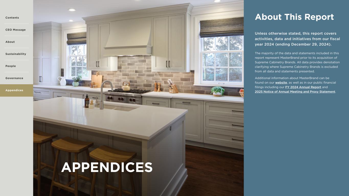 38 APPENDICES The majority of the data and statements included in this report represent MasterBrand prior to its acquisition of Supreme Cabinetry Brands. All data provides denotation clarifying where Supreme Cabinetry Brands is excluded from all data and statements presented. Additional information about MasterBrand can be found on our website, as well as in our public financial filings including our FY 2024 Annual Report and 2025 Notice of Annual Meeting and Proxy Statement. About This Report Unless otherwise stated, this report covers activities, data and initiatives from our fiscal year 2024 (ending December 29, 2024). Contents CEO Message About Sustainability Governance Appendices People
