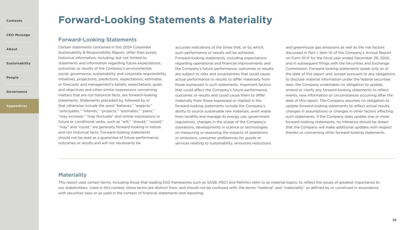 39 Forward-Looking Statements & Materiality Forward-Looking Statements Certain statements contained in this 2024 Corporate Sustainability & Responsibility Report, other than purely historical information, including, but not limited to, statements and information regarding future expectations, outcomes or results of the Company’s environmental, social, governance, sustainability and corporate responsibility initiatives, projections, predictions, expectations, estimates or forecasts and management’s beliefs, expectations, goals and objectives and other similar expressions concerning matters that are not historical facts, are forward-looking statements. Statements preceded by, followed by or that otherwise include the word “believes,” “expects,” “anticipates,” “intends,” “projects,” “estimates,” “plans,” “may increase,” “may fluctuate” and similar expressions or future or conditional verbs, such as “will,” “should,” “would,” “may” and “could,” are generally forward-looking in nature and not historical facts. Forward-looking statements should not be read as a guarantee of future performance, outcomes or results and will not necessarily be accurate indications of the times that, or by which, such performance or results will be achieved. Forward-looking statements, including expectations regarding operational and financial improvements and the Company’s future performance, outcomes or results, are subject to risks and uncertainties that could cause actual performance or results to differ materially from those expressed in such statements. Important factors that could affect the Company’s future performance, outcomes or results and could cause them to differ materially from those expressed or implied in the forward-looking statements include the Company’s ability to source sustainable raw materials, avert waste from landfills and manage its energy use, government regulations, changes in the scope of the Company’s operations, developments in science or technologies on measuring or assessing the impacts of operations or emissions, consumer preferences for goods or services relating to sustainability, emissions reductions and greenhouse gas emissions as well as the risk factors discussed in Part I, Item 1A of the Company’s Annual Report on Form 10-K for the fiscal year ended December 29, 2024, and in subsequent filings with the Securities and Exchange Commission. Forward-looking statements speak only as of the date of this report and, except pursuant to any obligations to disclose material information under the federal securities laws, the Company undertakes no obligation to update, amend or clarify any forward-looking statements to reflect events, new information or circumstances occurring after the date of this report. The Company assumes no obligation to update forward-looking statements to reflect actual results, changes in assumptions or changes in other factors affecting such statements. If the Company does update one or more forward-looking statements, no inference should be drawn that the Company will make additional updates with respect thereto or concerning other forward-looking statements. Materiality This report uses certain terms, including those that leading ESG frameworks such as SASB, MSCI and Refinitiv refer to as material topics, to reflect the issues of greatest importance to our stakeholders. Used in this context, these terms are distinct from, and should not be confused with, the terms “material” and “materiality” as defined by or construed in accordance with securities laws or as used in the context of financial statements and reporting. Contents CEO Message About Sustainability Governance Appendices People
