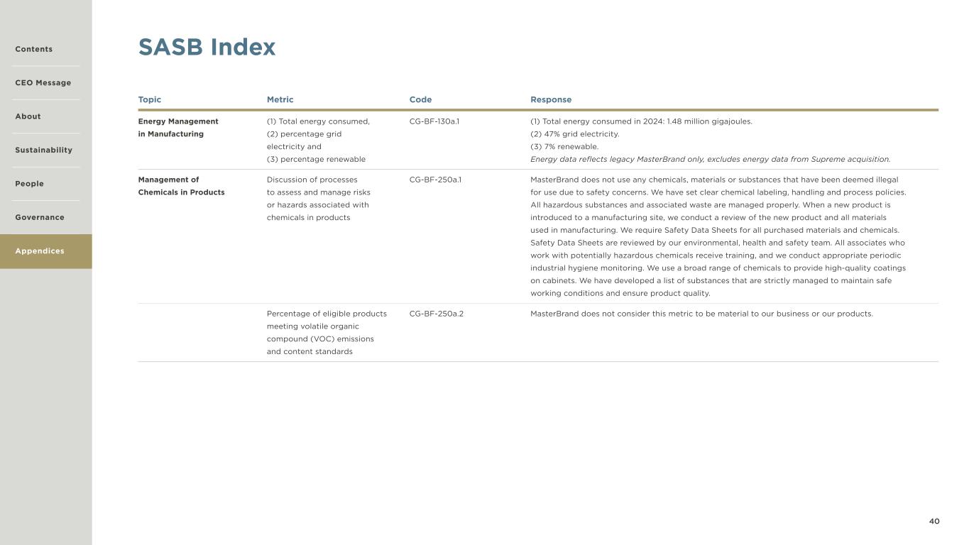 40 SASB Index Topic Metric Code Response Energy Management in Manufacturing (1) Total energy consumed, (2) percentage grid electricity and (3) percentage renewable CG-BF-130a.1 (1) Total energy consumed in 2024: 1.48 million gigajoules. (2) 47% grid electricity. (3) 7% renewable. Energy data reflects legacy MasterBrand only, excludes energy data from Supreme acquisition. Management of Chemicals in Products Discussion of processes to assess and manage risks or hazards associated with chemicals in products CG-BF-250a.1 MasterBrand does not use any chemicals, materials or substances that have been deemed illegal for use due to safety concerns. We have set clear chemical labeling, handling and process policies. All hazardous substances and associated waste are managed properly. When a new product is introduced to a manufacturing site, we conduct a review of the new product and all materials used in manufacturing. We require Safety Data Sheets for all purchased materials and chemicals. Safety Data Sheets are reviewed by our environmental, health and safety team. All associates who work with potentially hazardous chemicals receive training, and we conduct appropriate periodic industrial hygiene monitoring. We use a broad range of chemicals to provide high-quality coatings on cabinets. We have developed a list of substances that are strictly managed to maintain safe working conditions and ensure product quality. Percentage of eligible products meeting volatile organic compound (VOC) emissions and content standards CG-BF-250a.2 MasterBrand does not consider this metric to be material to our business or our products. Contents CEO Message About Sustainability Governance Appendices People