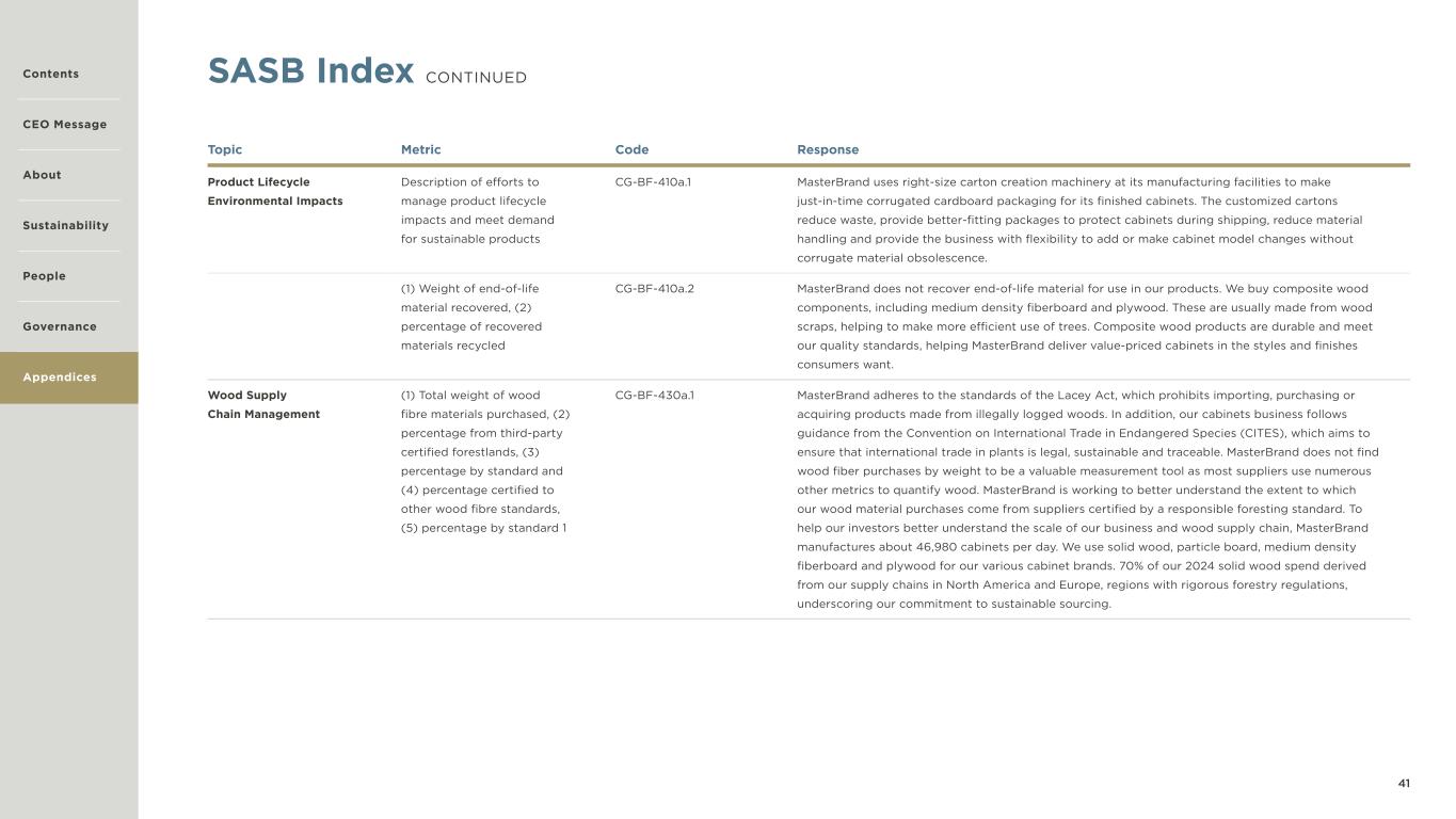 41 SASB Index CONTINUED Topic Metric Code Response Product Lifecycle Environmental Impacts Description of efforts to manage product lifecycle impacts and meet demand for sustainable products CG-BF-410a.1 MasterBrand uses right-size carton creation machinery at its manufacturing facilities to make just-in-time corrugated cardboard packaging for its finished cabinets. The customized cartons reduce waste, provide better-fitting packages to protect cabinets during shipping, reduce material handling and provide the business with flexibility to add or make cabinet model changes without corrugate material obsolescence. (1) Weight of end-of-life material recovered, (2) percentage of recovered materials recycled CG-BF-410a.2 MasterBrand does not recover end-of-life material for use in our products. We buy composite wood components, including medium density fiberboard and plywood. These are usually made from wood scraps, helping to make more efficient use of trees. Composite wood products are durable and meet our quality standards, helping MasterBrand deliver value-priced cabinets in the styles and finishes consumers want. Wood Supply Chain Management (1) Total weight of wood fibre materials purchased, (2) percentage from third-party certified forestlands, (3) percentage by standard and (4) percentage certified to other wood fibre standards, (5) percentage by standard 1 CG-BF-430a.1 MasterBrand adheres to the standards of the Lacey Act, which prohibits importing, purchasing or acquiring products made from illegally logged woods. In addition, our cabinets business follows guidance from the Convention on International Trade in Endangered Species (CITES), which aims to ensure that international trade in plants is legal, sustainable and traceable. MasterBrand does not find wood fiber purchases by weight to be a valuable measurement tool as most suppliers use numerous other metrics to quantify wood. MasterBrand is working to better understand the extent to which our wood material purchases come from suppliers certified by a responsible foresting standard. To help our investors better understand the scale of our business and wood supply chain, MasterBrand manufactures about 46,980 cabinets per day. We use solid wood, particle board, medium density fiberboard and plywood for our various cabinet brands. 70% of our 2024 solid wood spend derived from our supply chains in North America and Europe, regions with rigorous forestry regulations, underscoring our commitment to sustainable sourcing. Contents CEO Message About Sustainability Governance Appendices People