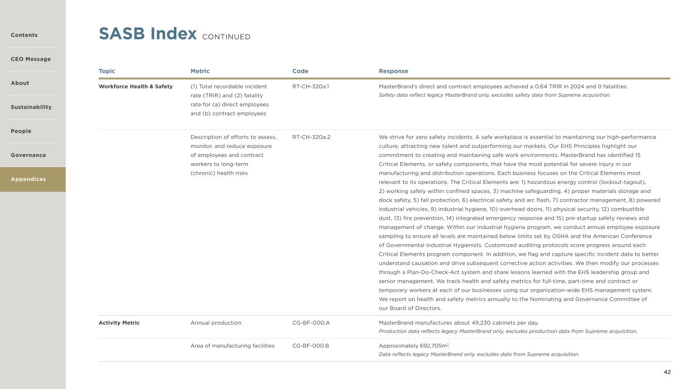 42 SASB Index CONTINUED Topic Metric Code Response Workforce Health & Safety (1) Total recordable incident rate (TRIR) and (2) fatality rate for (a) direct employees and (b) contract employees RT-CH-320a.1 MasterBrand’s direct and contract employees achieved a 0.64 TRIR in 2024 and 0 fatalities. Safety data reflect legacy MasterBrand only, excludes safety data from Supreme acquisition. Description of efforts to assess, monitor, and reduce exposure of employees and contract workers to long-term (chronic) health risks RT-CH-320a.2 We strive for zero safety incidents. A safe workplace is essential to maintaining our high-performance culture, attracting new talent and outperforming our markets. Our EHS Principles highlight our commitment to creating and maintaining safe work environments. MasterBrand has identified 15 Critical Elements, or safety components, that have the most potential for severe injury in our manufacturing and distribution operations. Each business focuses on the Critical Elements most relevant to its operations. The Critical Elements are: 1) hazardous energy control (lockout-tagout), 2) working safely within confined spaces, 3) machine safeguarding, 4) proper materials storage and dock safety, 5) fall protection, 6) electrical safety and arc flash, 7) contractor management, 8) powered industrial vehicles, 9) industrial hygiene, 10) overhead doors, 11) physical security, 12) combustible dust, 13) fire prevention, 14) integrated emergency response and 15) pre-startup safety reviews and management of change. Within our industrial hygiene program, we conduct annual employee exposure sampling to ensure all levels are maintained below limits set by OSHA and the American Conference of Governmental Industrial Hygienists. Customized auditing protocols score progress around each Critical Elements program component. In addition, we flag and capture specific incident data to better understand causation and drive subsequent corrective action activities. We then modify our processes through a Plan-Do-Check-Act system and share lessons learned with the EHS leadership group and senior management. We track health and safety metrics for full-time, part-time and contract or temporary workers at each of our businesses using our organization-wide EHS management system. We report on health and safety metrics annually to the Nominating and Governance Committee of our Board of Directors. Activity Metric Annual production CG-BF-000.A MasterBrand manufactures about 49,230 cabinets per day. Production data reflects legacy MasterBrand only, excludes production data from Supreme acquisition. Area of manufacturing facilities CG-BF-000.B Approximately 692,705m2. Data reflects legacy MasterBrand only, excludes data from Supreme acquisition. Contents CEO Message About Sustainability Governance Appendices People