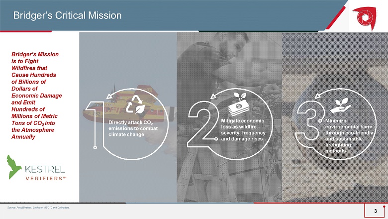 Basis of Presentation This Presentation (this “Presentation”) is provided for informational purposes only and has been prepared to assist intereste d p arties in making their own evaluation with respect to an investment opportunity in Bridger Aerospace Group Holdings, Inc. (“Bridger”, “Bridger Aerospace” or the “Company”) and for no other purp ose . By accepting, reviewing or reading this Presentation, you will be deemed to have agreed to the obligations and restrictions set out below. No Offer or Solicitation This Presentation and any oral statements made in connection with this Presentation do not constitute an offer to sell, or a sol icitation of an offer to buy, or a recommendation to purchase, any securities in any jurisdiction, nor shall there be any sale, issuance or transfer of any securities in any jurisdiction where, or to any pe rson to whom, such offer, solicitation or sale may be unlawful under the laws of such jurisdiction. This Presentation does not constitute either advice or a recommendation regarding any securities. No offer ing of securities shall be made except by means of a prospectus meeting the requirements of the Securities Act of 1933, as amended, or an exemption therefrom. Industry and Market Data No representations or warranties, express, implied or statutory are given in, or in respect of, this Presentation, and no per son may rely on the information contained in this Presentation. To the fullest extent permitted by law, in no circumstances will Bridger or any of its respective subsidiaries, stockholders, affiliates, re pre sentatives, partners, directors, officers, employees, advisers or agents be responsible or liable for any direct, indirect or consequential loss or loss of profit arising from the use of this Presentat ion , its contents, its omissions, reliance on the information contained within it or on opinions communicated in relation thereto or otherwise arising in connection therewith. This Presentation discusses trends an d m arkets that Bridger’s leadership team believes will impact the development and success of Bridger based on its current understanding of the marketplace. Industry and market data used in th is Presentation have been obtained from third - party industry publications and sources as well as from research reports prepared for other purposes. Bridger has not independently verified the data obt ain ed from these sources and cannot assure you of the reasonableness of any assumptions used by these sources or the data’s accuracy or completeness. Any data on past performance or modeling contai ned herein is not an indication as to future performance. This data is subject to change. Recipients of this Presentation are not to construe its contents, or any prior or subsequent communication s f rom Bridger or its respective representatives as investment, legal or tax advice. The Recipient should seek independent third party legal, regulatory, accounting and/or tax advice regarding this Pres ent ation. In addition, this Presentation does not purport to be all - inclusive or to contain all of the information that may be required to make a full analysis of Bridger. Recipients of this Presentation sh oul d each make their own evaluation of Bridger and of the relevance and adequacy of the information and should make such other investigations as they deem necessary. Bridger assumes no obligation t o u pdate the information in this Presentation. Important Disclaimers 2