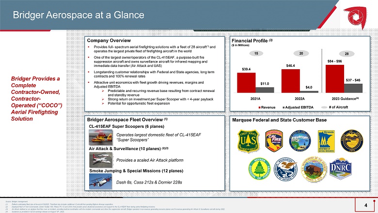 Source: Bridger management. (1) Reflects anticipated fleet size at the end of 3Q2023 .Total fleet size includes additional 12 aircraft from pending Bighorn A irw ays acquisition. (2) Deployed fleet of Twin Commander, Daher Kodiak 100, Pilatus PC - 12 and UAVs that provide aerial situational awareness and support to the CL - 415EAF fleet during active firefighting missions. (3) Air Attack defined as an airplane that flies over an incident, providing tactical coordination with the incident commander and other fire suppression aircraft. Bridger operated 4 non - revenue generating resource planes and 9 revenue generating Air Attack & Surveillance aircraft during 2022 . (4) Guidance as provided in Q2’23 earnings release on August 10 th , 2023 . Bridger Provides a Complete Contractor - Owned, Contractor - Operated (“COCO”) Aerial Firefighting Solution Company Overview Marquee Federal and State Customer Base ▪ Provides full - spectrum aerial firefighting solutions with a fleet of 28 aircraft (1) and operates the largest private fleet of firefighting aircraft in the world ▪ O ne of the largest owner/operators of the CL - 415EAF, a purpose - built fire suppression aircraft and owns surveillance aircraft for infrared mapping and immediate data transfer (Air Attack and UAS) ▪ Longstanding c ustomer r elationships with Federal and State a gencies , l ong t erm c ontracts and 100% r enewal r ates ▪ Attractive u nit e conomics with f leet g rowth driving r evenues , m argins and Adjusted EBITDA » Predictable and recurring revenue base resulting from contract renewal and standby revenue » Strong return on investment per Super Scooper with < 4 - year payback » Potential for opportunistic fleet expansion Bridger Aerospace Fleet Overview (1) CL - 415EAF Super Scoopers (6 planes) Operates largest domestic fleet of CL - 415EAF “Super Scoopers” Air Attack & Surveillance ( 10 planes) (2)(3) Provides a scaled Air Attack platform Smoke Jumping & Special Missions (1 2 planes) Dash 8s, Casa 212s & Dornier 228s Bridger Aerospace at a Glance 15 20 Financial Profile (3) ($ in Millions) $39.4 $46.4 $84 - $96 $11.0 $4.0 $37 - $45 2021A 2022 A 2023 Guidance (4) Revenue Adjusted EBITDA # of Aircraft 28 4