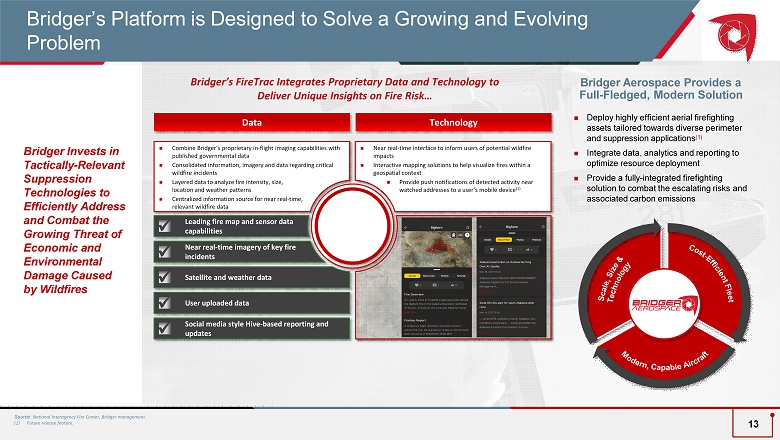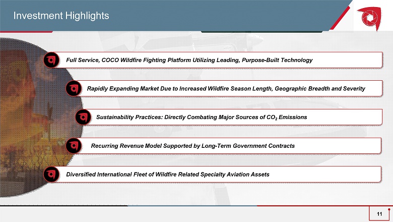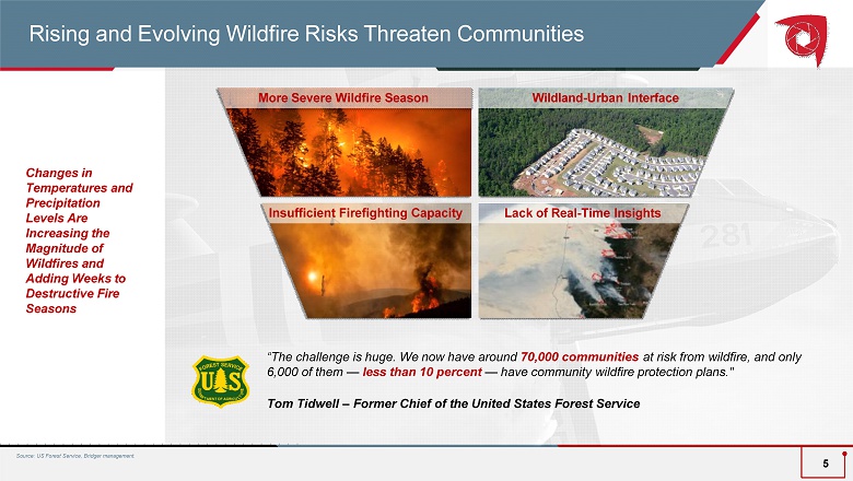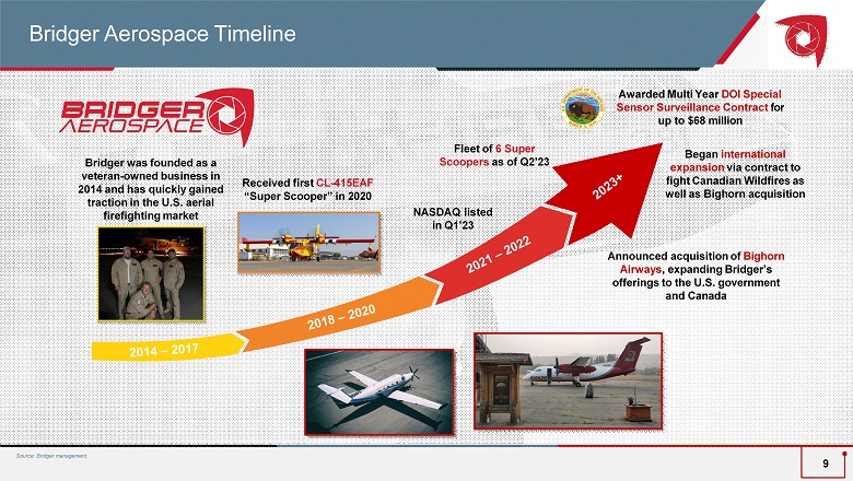 $5.8 bn $0.3 bn $3.2 bn $3.1 bn $9.5 bn Source: National Interagency Coordination Center, CNN, CBS, The Guardian and Bridger management estimates. (1) Bridger management defines the global firefighting market as the sum of the air - based suppression, ground, and fire data, aerial imagery - related, and emergency mobile application markets. (2) GOCO: Government Owned and Contractor Operated , (3) Based on the global aerial firefighting market size from the June 2021 Verified Market Research report and an industry estimate of the relative proportion of COCO, GOCO, and GOGO. (4) Based on Bridger management’s estimated $4.3 billion US ground market based on budgeted wildfire expenditures for key federal and state agencies; Bridger management estimated that the US ground market represented approximately 45% of the global ground market. (5) Based on Bridger management’s estimated $0.9 billion US market for the fire data and surveillance - related emergency market based on review of available peer c ompany data; Bridger management estimated that the US fire data and surveillance - related emergency market represented approximat ely 31% of the global fire data, aerial imagery - related, and emergency mobile application market. Aerial Suppression Spend Represented ~43% of the $22B Firefighting Market in 2021 (1) … (2) (2) … and the Market is Anticipated to Continue to Expand as Wildfires Rage Across Europe and North America ▪ There is a rapidly growing need globally for fire suppression assets ▪ The shift away from ground towards more air - based suppression has already commenced ▪ Wildland Fire Mitigation and Management Commission Aerial Equipment Strategy Report prioritizes fire aviation as a key and initial priority. ▪ Unfulfilled requests for fixed wing aircraft for aerial firefighting grew at a compound annual growth rate of 8.1% between 2002 and 2021, resulting in 1,254 unfulfilled requests in 2021 Federal and State Agencies Have Become Increasingly Motivated to Outsource Aerial Firefighting to More Effectively Combat the Increasing Presence and Intensity of Wildfires Air - Based Suppression (3) Large Market With Strong Demand for Air - Based Suppression Technologies ▪ These events represent Summer 2022 wildfires and emphasize the need for increased wildfire suppression resources globally ▪ In traditional wildfire areas, wildfire intensity and duration are increasing, and total wildfire impact is spreading into new regions as global temperatures rise Greece Faced a Disaster of Unprecedented Proportion Wildfires Ravaged Across Alaska with 264 Active Individual Fires Wildfires Raged Across Southern Italy as Its Rivers Dried Up COCO GOCO GOGO Ground (4) Data (5) Federal Spending on Wildfire Suppression Continues to Grow $0 $1,000 $2,000 $3,000 $4,000 1985 1987 1989 1991 1993 1995 1997 1999 2001 2003 2005 2007 2009 2011 2013 2015 2017 2019 2021 Forest Service & DOI Agencies 10 - yr CAGR: 16.5% 36 - yr CAGR : 8.4% ($ in Millions) $5,000 12