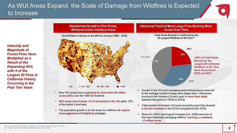 23% 36% 41% 2021 Pre - 2020 ~60% of Total Acres Burned by the Largest 20 California Wildfires of All Time Have Occurred in 2020 and 2021 Residential Growth in Fire - Prone, Wildland - Urban Interface Areas < 0% 0% – 25% 25% – 75% > 75% ▪ New WUI areas have expanded by more than 46 million acres (33%) over the 1990 - 2010 period ▪ WUI areas now include 1/3 of all homes in the US within 10% of the nation’s land area ▪ The population growth in at - risk areas for wildfires will require more aggressive firefighting strategies Growth Rate of Homes in the WUI by County (1990 – 2010) Total Acres Burned in California by the 20 Largest Wildfires of All Time (1) ▪ Growth in the WUI and increasing global temperatures have led to the average number of large fires (larger than 1,000 acres) burning in the Western US each year to more than triple between the period of 1970s to 2010s ▪ Total number of Western US acres burned by such fires showed a six - fold increase in the 2010s compared to the 1970s ▪ Dixie (CA, 2021) and August Complex (CA, 2020) were two of the most historically damaging wildfires, burning a combined ~2 million acres Historical Trend of More Large Fires Burning More Acres Over Time 2020 Intensity and Magnitude of Forest Fires Have Multiplied as a Result of the Expanding WUI, with 9 of the Largest 20 Fires in California History Occurring in the Past Two Years As WUI Areas Expand, the Scale of Damage from Wildfires is Expected to Increase Source: US Forest Service, National Interagency Fire Center, Climate Central, and CalFire. (1) Figures represent cumulative statistics as of January 13, 2022. 8