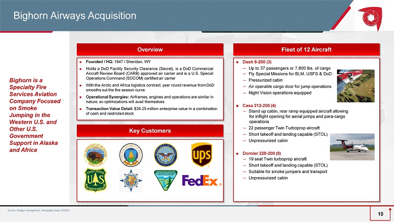  Founded / HQ : 1947 / Sheridan, WY  Holds a DoD Facility Security Clearance (Secret), is a DoD Commercial Aircraft Review Board (CARB) approved air carrier and is a U . S . Special Operations Command (SOCOM) certified air carrier  With the Arctic and Africa logistics contract, year round revenue from DoD smooths out the fire season curve  Operational Synergies: Airframes, engines and operations are similar in nature, so optimizations will avail themselves  Transaction Value Detail: $39.25 million enterprise value in a combination of cash and restricted stock Bighorn Airways Acquisition Fleet of 12 Aircraft Overview Bighorn is a S pecialty F ire S ervices A viation C ompany F ocused on S moke J umping in the W estern U.S. and O ther U.S. Government Support in Alaska and Africa Source: Bridger management . Anticipated close 3Q2023.  Dash 8 - 2 00 (3) — Up to 37 passengers or 7,800 lbs. of cargo — Fly Special Missions for BLM, USFS & DoD — Pressurized cabin — Air operable cargo door for jump operations — Night Vision operations equipped  Casa 212 - 200 (4) — Stand up cabin, rear ramp equipped aircraft allowing for inflight opening for aerial jumps and para - cargo operations — 22 passenger Twin Turboprop aircraft — Short takeoff and landing capable (STOL) — Unpressurized cabin  Dornier 228 - 200 (5) — 19 seat Twin turboprop aircraft — Short takeoff and landing capable (STOL) — Suitable for smoke jumpers and transport — Unpressurized cabin Key Customers 10