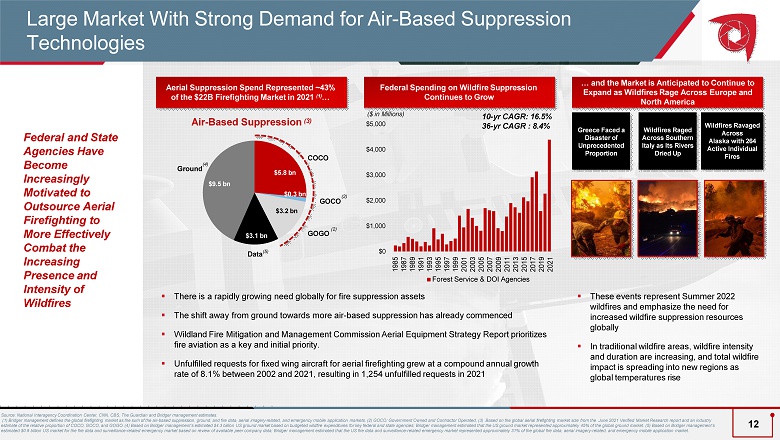 Diversified International Fleet of Wildfire Related Specialty Aviation Assets Recurring Revenue Model Supported by Long - Term Government Contracts Sustainability Practices: Directly Combating Major Sources of CO 2 Emissions Rapidly Expanding Market Due to Increased Wildfire Season Length, Geographic Breadth and Severity Full Service, COCO Wildfire Fighting Platform Utilizing Leading, Purpose - Built Technology Investment Highlights 11