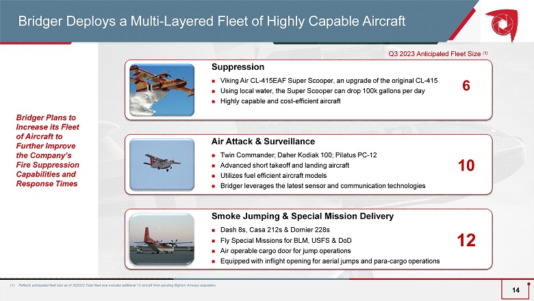 Bridger’s FireTrac Integrates Proprietary Data and Technology to Deliver Unique Insights on Fire Risk… Bridger Invests in Tactically - Relevant Suppression Technologies to Efficiently Address and Combat the Growing Threat of Economic and Environmental Damage Caused by Wildfires  Deploy highly efficient aerial firefighting assets tailored towards diverse perimeter and suppression applications (1)  Integrate data, analytics and reporting to optimize resource deployment  Provide a fully - integrated firefighting solution to combat the escalating risks and associated carbon emissions Bridger Aerospace Provides a Full - Fledged, Modern Solution Bridger’s Platform is Designed to Solve a Growing and Evolving Problem Source: National Interagency Fire Center, Bridger management. (1) Future release feature. 13  Combine Bridger’s proprietary in - flight imaging capabilities with published governmental data  Consolidated information, imagery and data regarding critical wildfire incidents  Layered data to analyze fire intensity, size, location and weather patterns  Centralized information source for near real - time, relevant wildfire data  Near real - time interface to inform users of potential wildfire impacts  Interactive mapping solutions to help visualize fires within a geospatial context  Provide push notifications of detected activity near watched addresses to a user’s mobile device (1) Leading fire map and sensor data capabilities Near real - time imagery of key fire incidents Satellite and weather data Social media style Hive - based reporting and updates User uploaded data Data Technology x x x x x