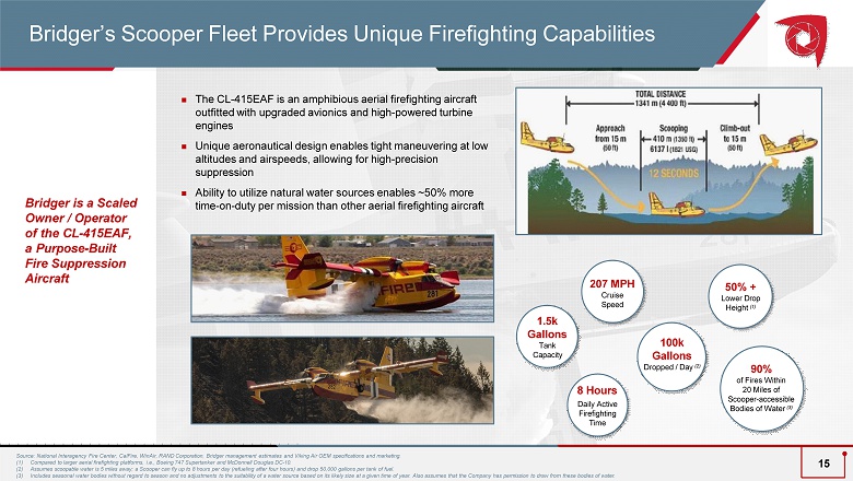 Suppression  Viking Air CL - 415EAF Super Scooper, an upgrade of the original CL - 415  Using local water, the Super Scooper can drop 100k gallons per day  Highly capable and cost - efficient aircraft Air Attack & Surveillance  Twin Commander; Daher Kodiak 100; Pilatus PC - 12  Advanced short takeoff and landing aircraft  Utilizes fuel efficient aircraft models  Bridger leverages the latest sensor and communication technologies Smoke Jumping & Special Mission Delivery  Dash 8s, Casa 212s & Dornier 228s  Fly Special Missions for BLM, USFS & DoD  Air operable cargo door for jump operations  Equipped with inflight opening for aerial jumps and para - cargo operations 6 10 1 2 Bridger Plans to Increase its Fleet of Aircraft to Further Improve the Company’s Fire Suppression Capabilities and Response Times Q3 2023 Anticipated Fleet Size (1) Bridger Deploys a Multi - Layered Fleet of Highly Capable Aircraft (1) Reflects anticipated fleet size as of 3Q2023.Total fleet size includes additional 12 aircraft from pending Bighorn Airways acquisition. 14