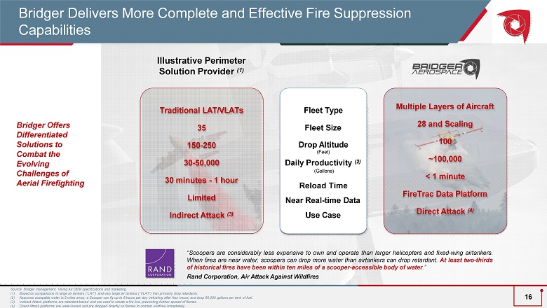 Source: National Interagency Fire Center, CalFire, WinAir, RAND Corporation, Bridger management estimates and Viking Air OEM specifications and marketing. (1) Compared to larger aerial firefighting platforms, i.e., Boeing 747 Supertanker and McDonnell Douglas DC - 10. (2) Assumes scoopable water is 5 miles away; a Scooper can fly up to 8 hours per day (refueling after four hours) and drop 50,000 gallons per tank of fuel. (3) Includes seasonal water bodies without regard to season and no adjustments to the suitability of a water source based on its likely size at a given time of year. Also assumes that the Company has permission to draw from these bodies of water.  The CL - 415EAF is an amphibious aerial firefighting aircraft outfitted with upgraded avionics and high - powered turbine engines  Unique aeronautical design enables tight maneuvering at low altitudes and airspeeds, allowing for high - precision suppression  Ability to utilize natural water sources enables ~50% more time - on - duty per mission than other aerial firefighting aircraft 207 MPH Cruise Speed 8 Hours Daily Active Firefighting Time 1.5k Gallons Tank Capacity 90% of Fires Within 20 Miles of Scooper - accessible Bodies of Water (3) 100k Gallons Dropped / Day (2) 50% + Lower Drop Height (1) Bridger is a Scaled Owner / Operator of the CL - 415EAF, a Purpose - Built Fire Suppression Aircraft Bridger’s Scooper Fleet Provides Unique Firefighting Capabilities 15