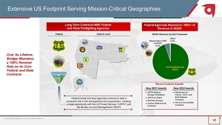 Traditional LAT/VLATs 35 150 - 250 30 - 50,000 30 minutes - 1 hour Limited Indirect Attack (3) “Scoopers are considerably less expensive to own and operate than larger helicopters and fixed - wing airtankers . When fires are near water, scoopers can drop more water than airtankers can drop retardant . At least two - thirds of historical fires have been within ten miles of a scooper - accessible body of water . ” Rand Corporation, Air Attack Against Wildfires Bridger Offers Differentiated Solutions to Combat the Evolving Challenges of Aerial Firefighting Source: Bridger management, Viking Air OEM specifications and marketing. (1) Based on comparisons to large air tankers (“LAT”) and very large air tankers (“VLAT”) that primarily drop retardants. (2) Assumes scoopable water is 5 miles away; a Scooper can fly up to 8 hours per day (refueling after four hours) and drop 50,000 gallons per tank of fuel. (3) Indirect Attack platforms are retardant - based and are used to create a fire line, preventing further spread of flames. (4) Direct Attack platforms are water - based and are dropped directly on flames to combat wildfires immediately. Bridger Delivers More Complete and Effective Fire Suppression Capabilities Multiple Layers of Aircraft 2 8 and Scaling 100 ~100,000 < 1 minute FireTrac Data Platform Direct Attack (4) Illustrative Perimeter Solution Provider (1) ) Fleet Type Fleet Size Daily Productivity (2 ) (Gallons) Near Real - time Data Use Case Drop Altitude (Feet) Reload Time 16