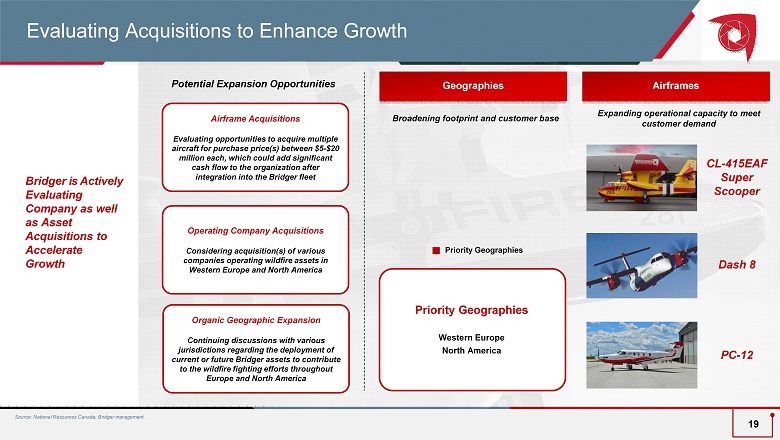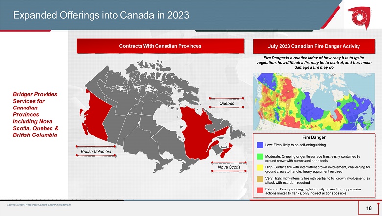 Contracts With Canadian Provinces July 2023 Canadian Fire Danger Activity Bridger Provides Services for Canadian Provinces Including Nova Scotia, Quebec & British Columbia Source: National Resources Canada, Bridger management. Expand ed Offerings into Canada in 2023 Nova Scotia Quebec British Columbia Fire Danger Low: Fires likely to be self - extinguishing Moderate : Creeping or gentle surface fires, easily contained by ground crews with pumps and hand tools High: Surface fire with intermittent crown involvement, challenging for ground crews to handle; heavy equipment required Very High: High - intensity fire with partial to full crown involvement; air attack with retardant required Extreme: Fast - spreading, high - intensity crown fire; suppression actions limited to flanks, only indirect actions possible Fire Danger is a relative index of how easy it is to ignite vegetation, how difficult a fire may be to control, and how much damage a fire may do 18