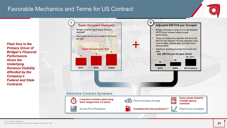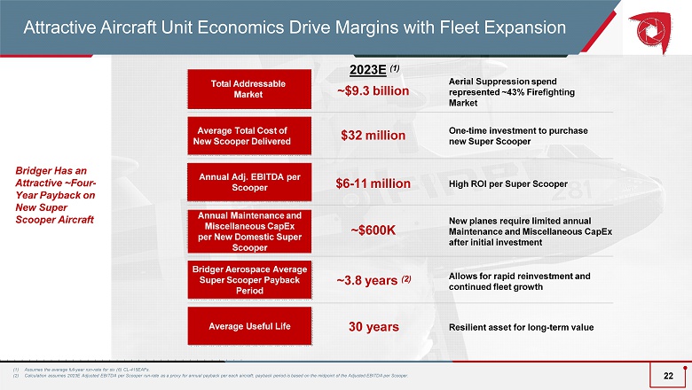 A B Super Scoopers Deployed ▪ Bridger currently has 6 Super Scoopers deployed ▪ Each plane can fly up to a total of 450 hours per year Long - term contract nature (avg. tenor ranges from 1 - 5 years) Annual Price Escalators Direct cost pass through Complete fuel price protection (3) Same assets listed for multiple agency contracts Flight hours uncapped Favorable Mechanics and Terms for US Contract Fleet Size Is the Primary Driver of Bridger’s Financial Performance Given the Underlying Revenue Visibility Afforded by the Company’s Federal and State Contracts Super Scoopers per Year Source: Bridger management . (1 ) Guidance as provided in Q2’23 earnings release on August 10th, 2023. . Attractive Contract Dynamics 4 5 6 2021A 2022A 2Q2023 $3 $6 Adjusted EBITDA per Scooper ▪ Bridger estimates a range of run - rate Adjusted EBITDA per Scooper based on past performance ▪ There are several key variables that drive Adj. EBITDA per Scooper including operating costs, contract rates, standby days and flight hours, among others ▪ Significant operating leverage from fixed cost base Adj. EBITDA per Scooper ($mm) $6 - $ 11 (1) 2021A 2022A 2023 Guidance 21