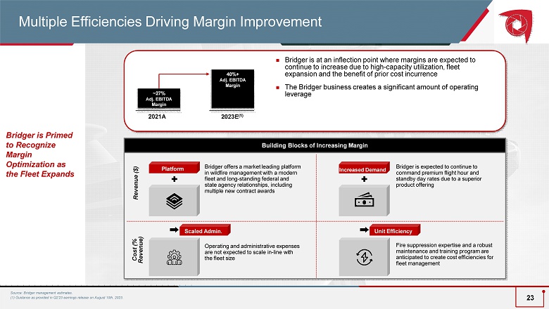 Building Blocks of Increasing Margin  Bridger is at an inflection point where margins are expected to continue to increase due to high - capacity utilization, fleet expansion and the benefit of prior cost incurrence  The Bridger business creates a significant amount of operating leverage Bridger offers a market leading platform in wildfire management with a modern fleet and long - standing federal and state agency relationships , including multiple new contract awards Bridger is expected to continue to command premium flight hour and standby day rate s due to a superior product offering Operating and administrative expenses are not expected to scale in - line with the fleet size Fire suppression expertise and a robust maintenance and training program are anticipated to create cost efficiencies for fleet management Platform Increased Demand Scaled Admin. Unit Efficiency ~27% Adj. EBITDA Margin 2021A 2023E (1) Revenue ($) 40%+ Adj. EBITDA Margin Cost (% Revenue) Multiple Efficiencies Driving Margin Improvement Bridger is Primed to Recognize Margin Optimization as the Fleet Expands Source: Bridger management estimates . (1) Guidance as provided in Q2’23 earnings release on August 10th, 2023. 23