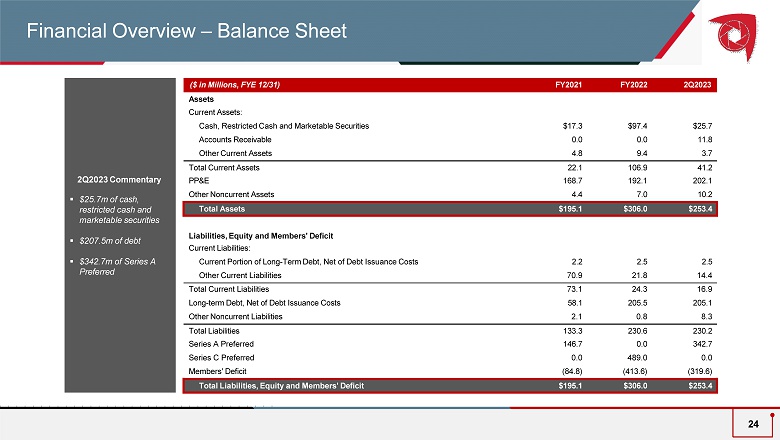 Financial Overview – Balance Sheet 24 2 Q2023 Commentary ▪ $ 25.7 m of cash, restricted cash and marketable securities ▪ $207.5m of debt ▪ $342.7m of Series A Preferred ($ in Millions , FYE 12/31) FY2021 FY2022 2 Q2023 Assets Current Assets: Cash, Restricted Cash and Marketable Securities $17.3 $97.4 $25.7 Accounts Receivable 0.0 0.0 11.8 Other Current Assets 4.8 9.4 3.7 Total Current Assets 22.1 106.9 41.2 PP&E 168.7 192.1 202.1 Other Noncurrent Assets 4.4 7.0 10.2 Total Assets $195.1 $306.0 $ 2 53.4 Liabilities, Equity and Members' Deficit Current Liabilities: Current Portion of Long - Term Debt, Net of Debt Issuance Costs 2.2 2.5 2.5 Other Current Liabilities 70.9 21.8 14.4 Total Current Liabilities 73.1 24.3 16.9 Long - term Debt, Net of Debt Issuance Costs 58.1 205.5 205.1 Other Noncurrent Liabilities 2.1 0.8 8.3 Total Liabilities 133.3 230.6 230. 2 Series A Preferred 146.7 0.0 342.7 Series C Preferred 0.0 489.0 0.0 Members' Deficit (84.8) ( 41 3.6 ) ( 319.6 ) Total Liabilities, Equity and Members' Deficit $195.1 $306.0 $253.4