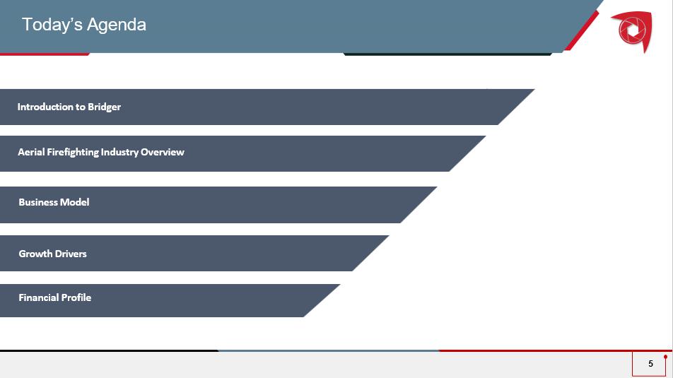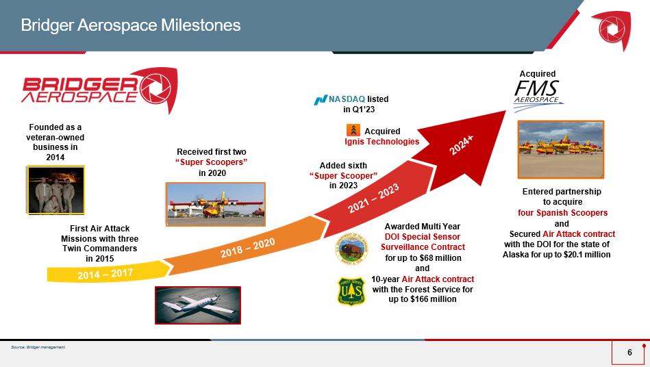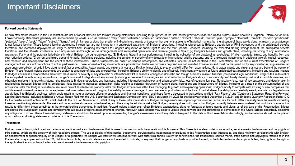 Important Disclaimers Forward Looking Statements Certain statements included in this Presentation are not historical facts but are forward - looking statements, including for purposes of the safe harbor provisions under the United States Private Securities Litigation Reform Act of 1995 . Forward - looking statements generally are accompanied by words such as “believe,” “may,” “will,” “estimate,” “continue,” “anticipate,” “intend,” “expect,” “should,” “would,” “plan,” “project,” “forecast,” “predict,” “poised,” “positioned,” “potential,” “seem,” “seek,” “future,” “outlook,” “target,” and similar expressions that predict or indicate future events or trends or that are not statements of historical matters, but the absence of these words does not mean that a statement is not forward - looking . These forward - looking statements include, but are not limited to, ( 1 ) anticipated expansion of Bridger’s operations, including references to Bridger’s acquisition of FMS Aerospace and the anticipated benefits therefrom, and increased deployment of Bridger’s aircraft fleet, including references to Bridger’s acquisition of and/or right to use the four Spanish Scoopers, including the expected closing timings thereof, the anticipated benefits therefrom, and the ultimate structure of such acquisitions and/or right to use arrangements and anticipated operational and revenue growth in Spain ; ( 2 ) Bridger’s business and growth plans, including the timing of any international expansion, if any, and the potential jurisdictions in which Bridger may generate revenue ; ( 3 ) Bridger’s future financial performance, including the collection of any outstanding receivables ; ( 4 ) the magnitude, timing, and benefits from any cost reduction actions ; ( 5 ) current and future demand for aerial firefighting services, including the duration or severity of any domestic or international wildfire seasons ; and ( 6 ) anticipated investments in additional aircraft, capital resources, and research and development and the effect of these investments . These statements are based on various assumptions and estimates, whether or not identified in this Presentation, and on the current expectations of Bridger’s management and are not predictions of actual performance . These forward - looking statements are provided for illustrative purposes only and are not intended to serve as and must not be relied on by any investor as, a guarantee, an assurance, a prediction or a definitive statement of fact or probability . Actual events and circumstances are difficult or impossible to predict and will differ from assumptions . Many actual events and circumstances are beyond the control of Bridger . These forward - looking statements are subject to a number of risks and uncertainties, including : Bridger’s ability to identify and effectively implement any current or future anticipated cost reductions, including any resulting impacts to Bridger’s business and operations therefrom ; the duration or severity of any domestic or international wildfire seasons ; changes in domestic and foreign business, market, financial, political and legal conditions ; Bridger’s failure to realize the anticipated benefits of any acquisitions ; Bridger’s successful integration of any aircraft (including achievement of synergies and cost reductions) ; Bridger’s ability to successfully and timely develop, sell and expand its services, and otherwise implement its growth strategy ; risks relating to Bridger’s operations and business, including information technology and cybersecurity risks, loss of requisite licenses, flight safety risks, loss of key customers and deterioration in relationships between Bridger and its employees ; risks related to increased competition ; risks relating to potential disruption of current plans, operations and infrastructure of Bridger, including as a result of the consummation of any acquisition ; risks that Bridger is unable to secure or protect its intellectual property ; risks that Bridger experiences difficulties managing its growth and expanding operations ; Bridger's ability to compete with existing or new companies that could cause downward pressure on prices, fewer customer orders, reduced margins, the inability to take advantage of new business opportunities, and the loss of market share ; the ability to successfully select, execute or integrate future acquisitions into Bridger's business, which could result in material adverse effects to operations and financial conditions ; and those factors discussed in the sections entitled “Risk Factors” and “Cautionary Statement Regarding Forward - Looking Statements” included in Bridger’s Annual Report filed with the U . S . Securities and Exchange Commission (the “SEC”) on March 14 , 2025 for the fiscal year ended December 31 , 2024 , and Bridger’s Quarterly Report on Form 10 - Q for the quarter ended September 30 , 2024 filed with the SEC on November 13 , 2024 . If any of these risks materialize or Bridger management’s assumptions prove incorrect, actual results could differ materially from the results implied by these forward - looking statements . The risks and uncertainties above are not exhaustive, and there may be additional risks that Bridger presently does not know or that Bridger currently believes are immaterial that could also cause actual results to differ from those contained in the forward - looking statements . In addition, forward - looking statements reflect Bridger’s expectations, plans or forecasts of future events and views as of the date of this Presentation . Bridger anticipates that subsequent events and developments will cause Bridger’s assessments to change . However, while Bridger may elect to update these forward - looking statements at some point in the future, Bridger specifically disclaims any obligation to do so . Thes