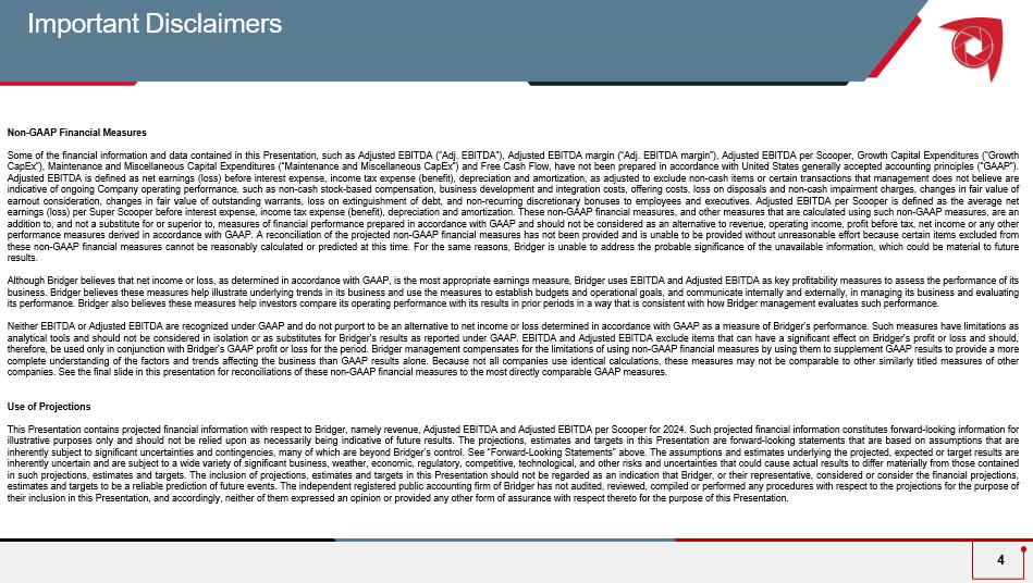 Important Disclaimers Non - GAAP Financial Measures Some of the financial information and data contained in this Presentation, such as Adjusted EBITDA (“Adj . EBITDA”), Adjusted EBITDA margin (“Adj . EBITDA margin”), Adjusted EBITDA per Scooper, Growth Capital Expenditures (“Growth CapEx”), Maintenance and Miscellaneous Capital Expenditures (“Maintenance and Miscellaneous CapEx”) and Free Cash Flow, have not been prepared in accordance with United States generally accepted accounting principles (“GAAP”) . Adjusted EBITDA is defined as net earnings (loss) before interest expense, income tax expense (benefit), depreciation and amortization, as adjusted to exclude non - cash items or certain transactions that management does not believe are indicative of ongoing Company operating performance, such as non - cash stock - based compensation, business development and integration costs, offering costs, loss on disposals and non - cash impairment charges, changes in fair value of earnout consideration, changes in fair value of outstanding warrants, loss on extinguishment of debt, and non - recurring discretionary bonuses to employees and executives . Adjusted EBITDA per Scooper is defined as the average net earnings (loss) per Super Scooper before interest expense, income tax expense (benefit), depreciation and amortization . These non - GAAP financial measures, and other measures that are calculated using such non - GAAP measures, are an addition to, and not a substitute for or superior to, measures of financial performance prepared in accordance with GAAP and should not be considered as an alternative to revenue, operating income, profit before tax, net income or any other performance measures derived in accordance with GAAP . A reconciliation of the projected non - GAAP financial measures has not been provided and is unable to be provided without unreasonable effort because certain items excluded from these non - GAAP financial measures cannot be reasonably calculated or predicted at this time . For the same reasons, Bridger is unable to address the probable significance of the unavailable information, which could be material to future results . Although Bridger believes that net income or loss, as determined in accordance with GAAP, is the most appropriate earnings measure, Bridger uses EBITDA and Adjusted EBITDA as key profitability measures to assess the performance of its business . Bridger believes these measures help illustrate underlying trends in its business and use the measures to establish budgets and operational goals, and communicate internally and externally, in managing its business and evaluating its performance . Bridger also believes these measures help investors compare its operating performance with its results in prior periods in a way that is consistent with how Bridger management evaluates such performance . Neither EBITDA or Adjusted EBITDA are recognized under GAAP and do not purport to be an alternative to net income or loss determined in accordance with GAAP as a measure of Bridger’s performance . Such measures have limitations as analytical tools and should not be considered in isolation or as substitutes for Bridger’s results as reported under GAAP . EBITDA and Adjusted EBITDA exclude items that can have a significant effect on Bridger’s profit or loss and should, therefore, be used only in conjunction with Bridger’s GAAP profit or loss for the period . Bridger management compensates for the limitations of using non - GAAP financial measures by using them to supplement GAAP results to provide a more complete understanding of the factors and trends affecting the business than GAAP results alone . Because not all companies use identical calculations, these measures may not be comparable to other similarly titled measures of other companies . See the final slide in this presentation for reconciliations of these non - GAAP financial measures to the most directly comparable GAAP measures . Use of Projections This Presentation contains projected financial information with respect to Bridger, namely revenue, Adjusted EBITDA and Adjusted EBITDA per Scooper for 2024 . Such projected financial information constitutes forward - looking information for illustrative purposes only and should not be relied upon as necessarily being indicative of future results . The projections, estimates and targets in this Presentation are forward - looking statements that are based on assumptions that are inherently subject to significant uncertainties and contingencies, many of which are beyond Bridger’s control . See “Forward - Looking Statements” above . The assumptions and estimates underlying the projected, expected or target results are inherently uncertain and are subject to a wide variety of significant business, weather, economic, regulatory, competitive, technological, and other risks and uncertainties that could cause actual results to differ materially from those contained in such projections, estimates and targets . The inclusion of projections, estimates and targets in this Presentation should not be regarded as an indication that Bridger, or their representative, considered or consider the financial projections, estimates and targets to be a reliable prediction of future events . The independent registered public accounting firm of Bridger has not audited, reviewed, compiled or performed any procedures with respect to the projections for the purpose of their inclusion in this Presentation, and accordingly, neither of them expressed an opinion or provided any other form of assurance with respect thereto for the purpose of this Presentation . 4