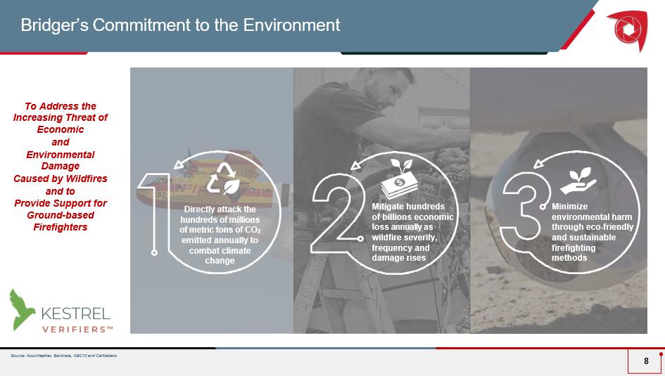 Bridger Aerospace at a Glance 7 ▪ Full - spectrum Aerial Firefighting and Aerospace Services Provider ▪ One of the largest owner/operators of the purpose - built “ Super Scooper” ▪ Surveillance aircraft for infrared mapping and immediate data transfer ( " Air Attack " ) ▪ Airframe modification and integration solutions including instrumentation, flight testing and airworthiness certification (FMS) ▪ Increased Demand and Funding for Wildfire Control and Aerial Firefighting Driven by : ▪ Climate change ▪ Population moving to wildfire prone areas (WUI) ▪ Shift from ground to aerial based suppression ▪ Insufficient Firefighting Capacity / Reduced Supply of Aerial Assets Leading to Unfilled Requests ▪ Longstanding Customer Relationships with Federal and State Agencies, Long Term Contracts and 100% Renewal Rates ▪ Attractive Unit Economics with Fleet Growth driving Revenues, Margins and Adjusted EBITDA ▪ Predictable and recurring revenue base resulting from contract renewal and standby revenue ▪ Strong return on investment per Super Scooper with ~ 4.5 - year Adj. EBITDA per Scooper payback period ▪ Potential for opportunistic fleet expansion