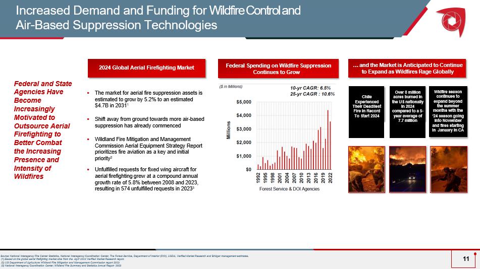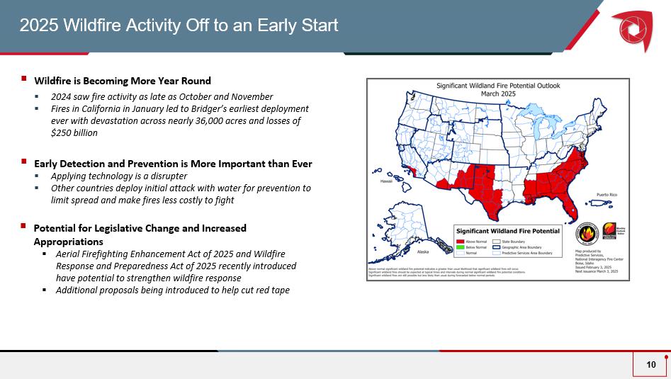 2025 Wildfire Activity Off to an Early Start ▪ Wildfire is Becoming More Year Round ▪ 2024 saw fire activity as late as October and November ▪ Fires in California in January led to Bridger’s earliest deployment ever with devastation across nearly 36,000 acres and losses of $250 billion ▪ Early Detection and Prevention is More Important than Ever ▪ Applying technology is a disrupter ▪ Other countries deploy initial attack with water for prevention to limit spread and make fires less costly to fight ▪ Potential for Legislative Change and Increased Appropriations ▪ Aerial Firefighting Enhancement Act of 2025 and Wildfire Response and Preparedness Act of 2025 recently introduced have potential to strengthen wildfire response ▪ Additional proposals being introduced to help cut red tape