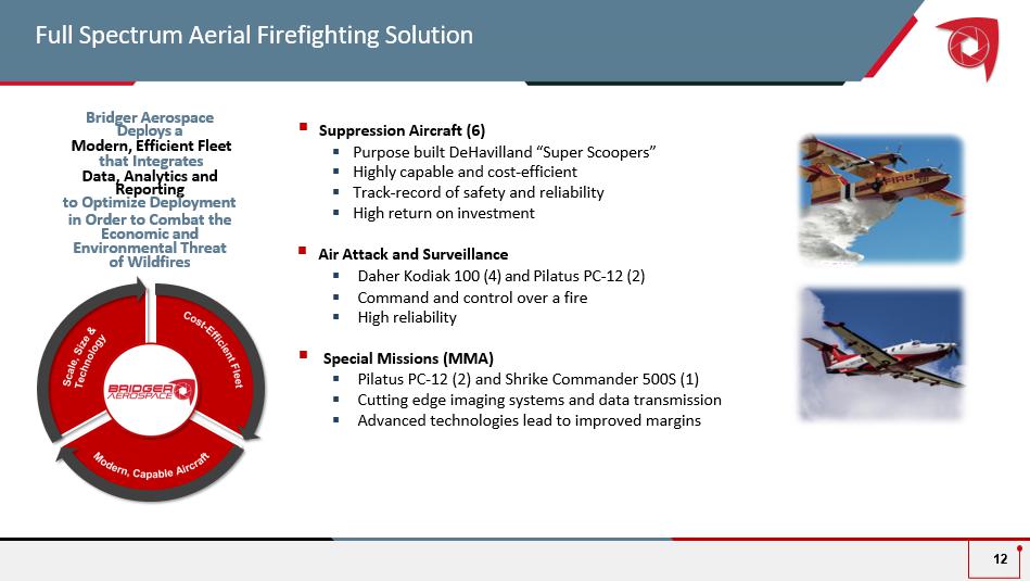 $5.8 bn $0.3 bn $3.1 bn $9.5 bn Source: National Interagency Fire Center Statistics, National Interagency Coordination Center, The Forest Service, Department of Interior (DOI), USDA, V erified Market Research and Bridger management estimates. (1). Based on the global aerial firefighting market size from the April 2024 Verified Market Research report . ( 2 ) US Department of Agriculture Wildland Fire Mitigation and Management Commission report 2023 (3) National Interagency Coordination Center, Wildland Fire Summary and Statistics Annual Report 2023 2024 Global Aerial Firefighting Market … and the Market is Anticipated to Continue to Expand as Wildfires Rage Globally ▪ The market for aerial fire suppression assets is estimated to grow by 5.2% to an estimated $4.7B in 2031 1 ▪ Shift away from ground towards more air - based suppression has already commenced ▪ Wildland Fire Mitigation and Management Commission Aerial Equipment Strategy Report prioritizes fire aviation as a key and initial priority 2 ▪ Unfulfilled requests for fixed wing aircraft for aerial firefighting grew at a compound annual growth rate of 5.8% between 2008 and 2023, resulting in 574 unfulfilled requests in 2023 3 Federal and State Agencies Have Become Increasingly Motivated to Outsource Aerial Firefighting to Better Combat the Increasing Presence and Intensity of Wildfires Increased Demand and Funding for Wildfire Control and Ai r - Based Suppression Technologies 11 Chile Experienced Their Deadliest Fire in Record To Start 2024 Widfire season continues to expand beyond the summer months with the ‘24 season going into November and fires starting in January in CA Over 8 million acres burned in the US nationally in 2024 compared to a 5 - year average of 7.7 million Federal Spending on Wildfire Suppression Continues to Grow Forest Service & DOI Agencies